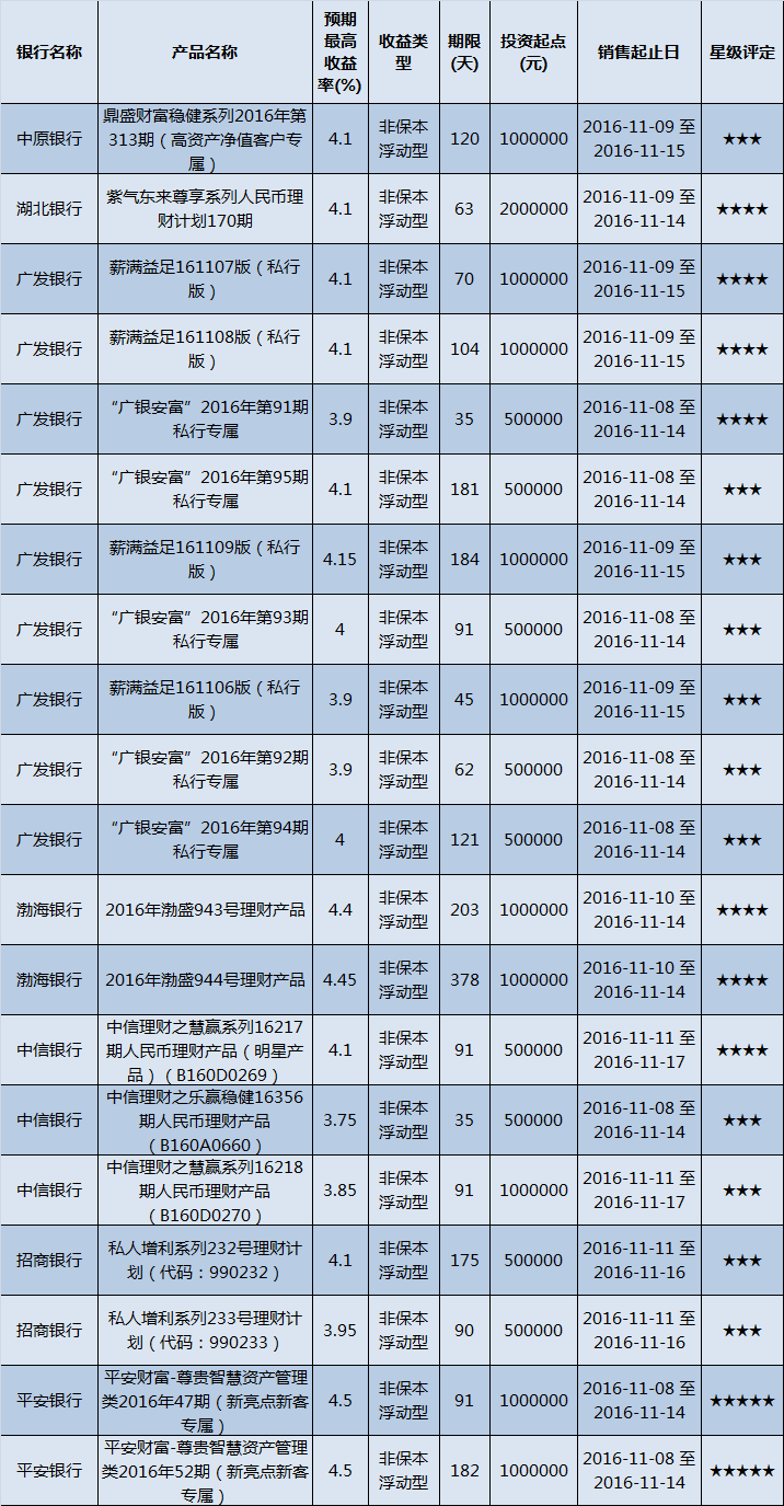 高门槛(50万元及以上)的理财产品中,华中地区有20款获得普益标准评级,平均预期收益率为4.10%。其中三星产品11款,平均预期收益率为3.98%;四星产品7款,平均预期收益率为4.16%;五星产品2款,平均预期收益率为4.50%。