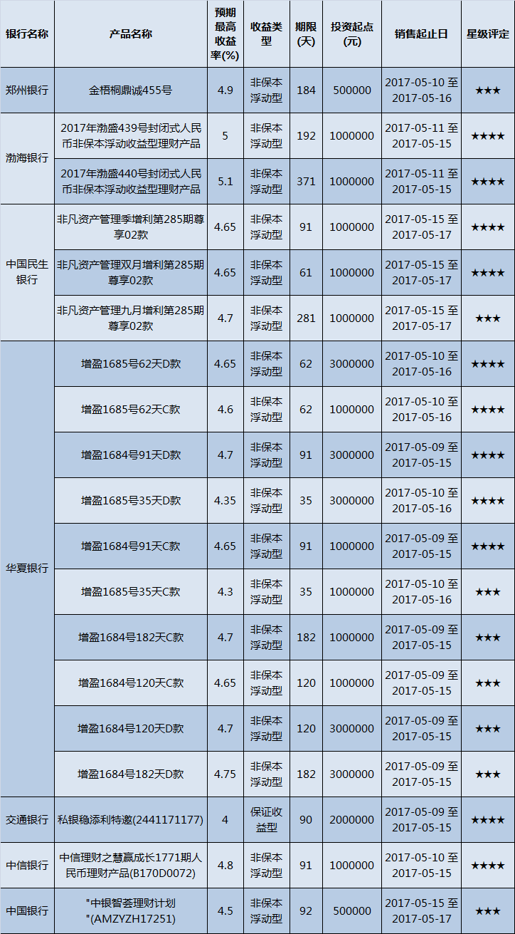 高门槛(50万元及以上)的理财产品中,华中地区有19款获得普益标准星级评定,平均预期收益率为4.65%。其中三星产品8款,平均预期收益率为4.65%;四星产品11款,平均预期收益率为4.65%;五星产品0款。
