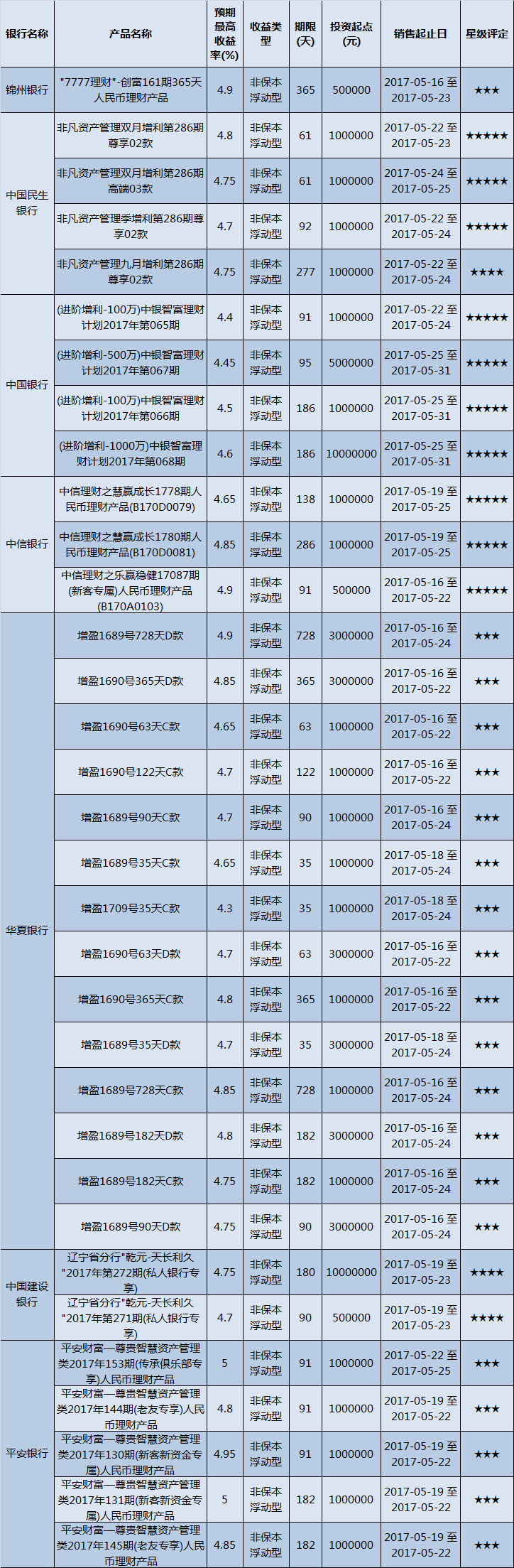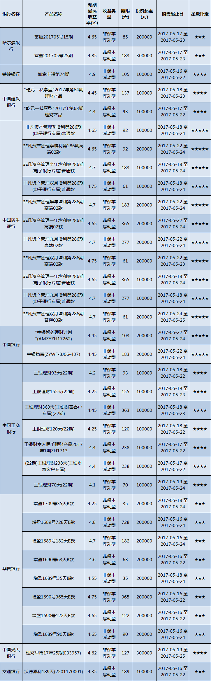 高门槛(50万元及以上)的理财产品中,东北地区有33款获得普益标准星级评定,平均预期收益率为4.74%。其中三星产品20款,平均预期收益率为4.78%;四星产品3款,平均预期收益率为4.73%;五星产品10款,平均预期收益率为4.66%。