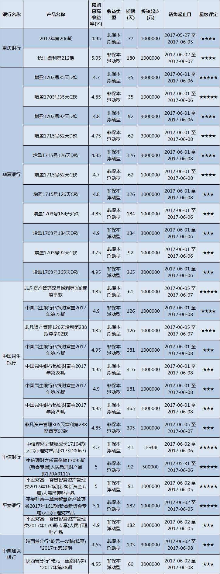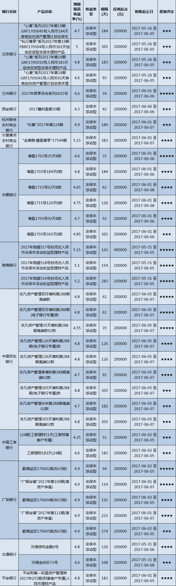 高门槛(50万元及以上)的理财产品中,西北地区有28款获得普益标准星级评定,平均预期收益率为4.85%。其中三星产品13款,平均预期收益率为4.84%;四星产品8款,平均预期收益率为4.86%;五星产品7款,平均预期收益率为4.86%。