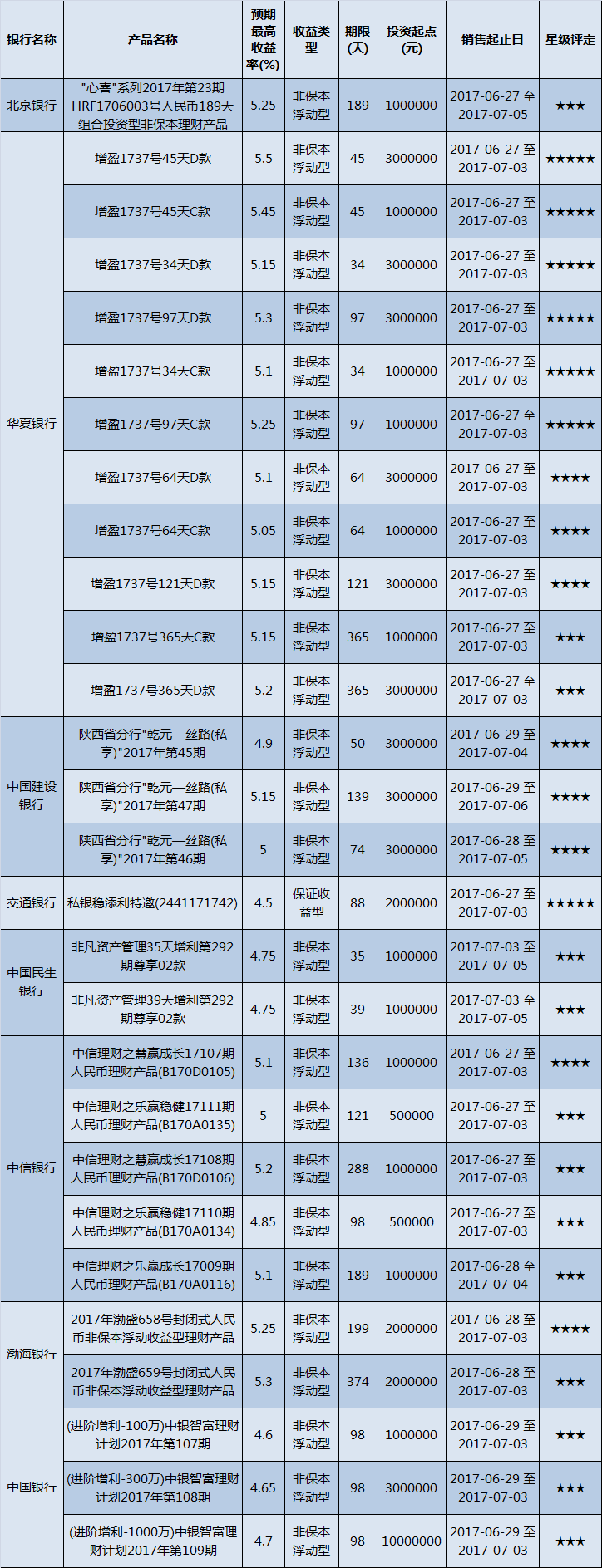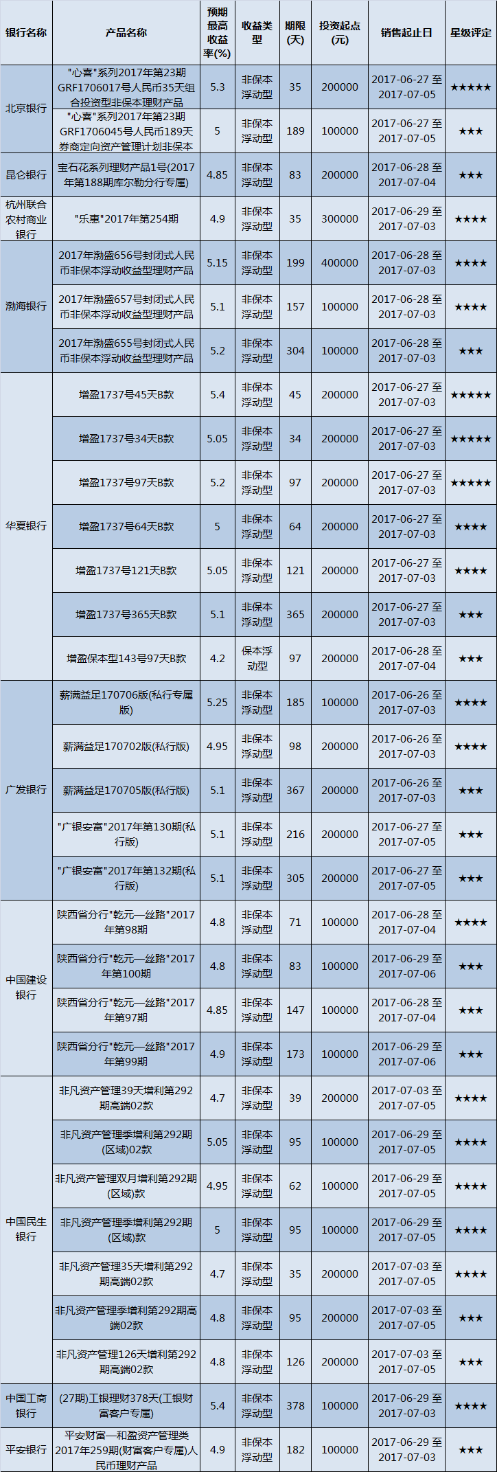 高门槛(50万元及以上)的理财产品中,西北地区有28款获得普益标准星级评定,平均预期收益率为5.05%。其中三星产品13款,平均预期收益率为4.96%;四星产品8款,平均预期收益率为5.09%;五星产品7款,平均预期收益率为5.18%。
