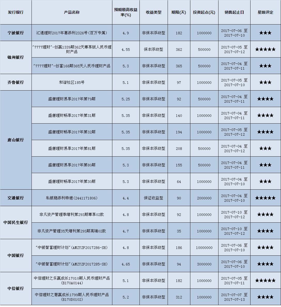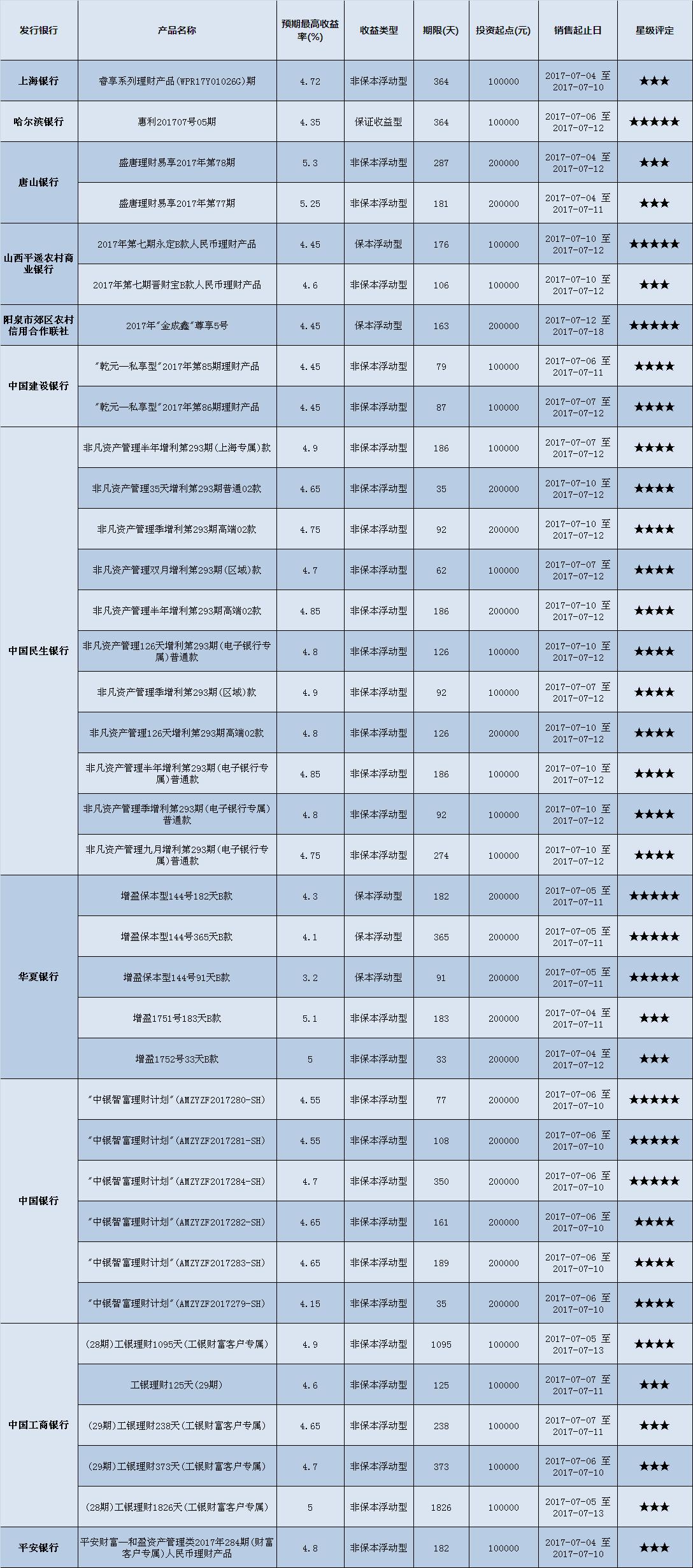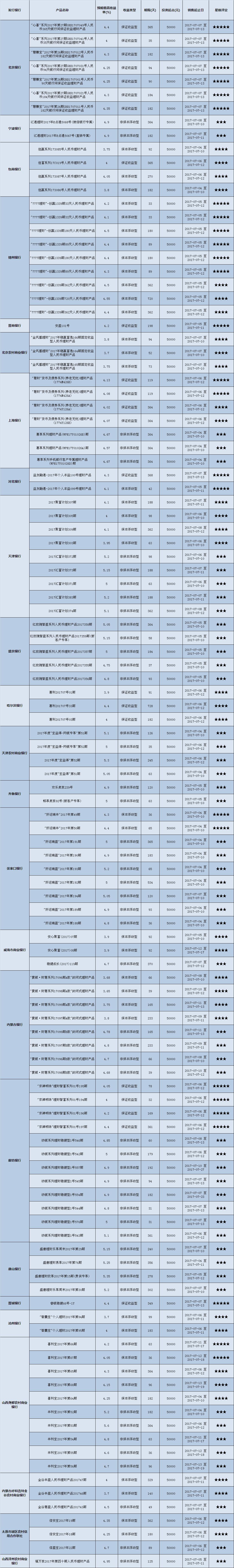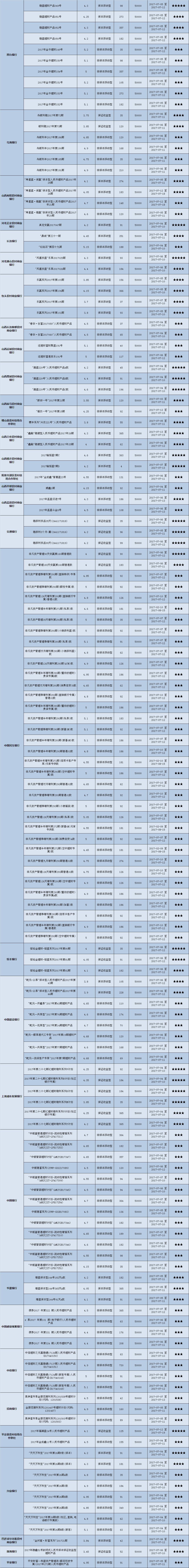 高门槛(50万元及以上)的理财产品中,华北地区有17款获得普益标准星级评定,平均预期收益率为5.02%。其中三星产品6款,平均预期收益率为5.21%;四星产品8款,平均预期收益率为5.01%;五星产品3款,平均预期收益率为4.68%。