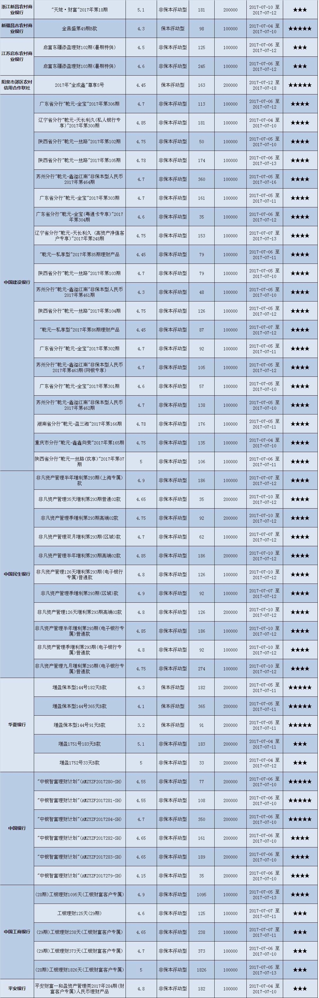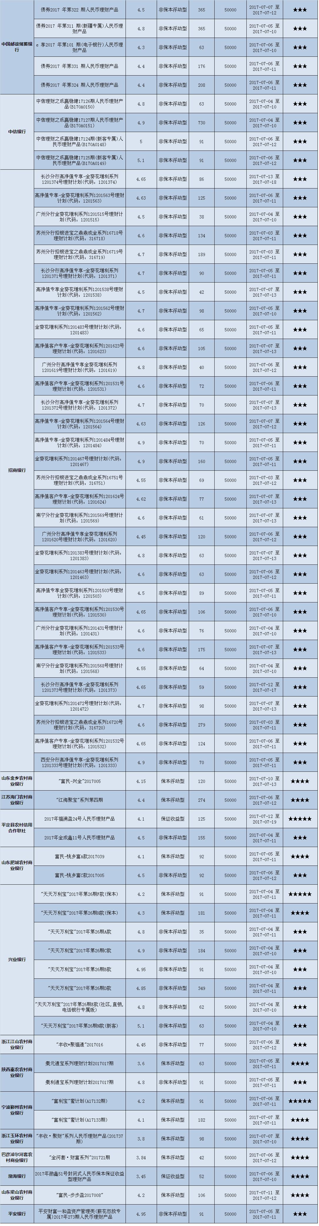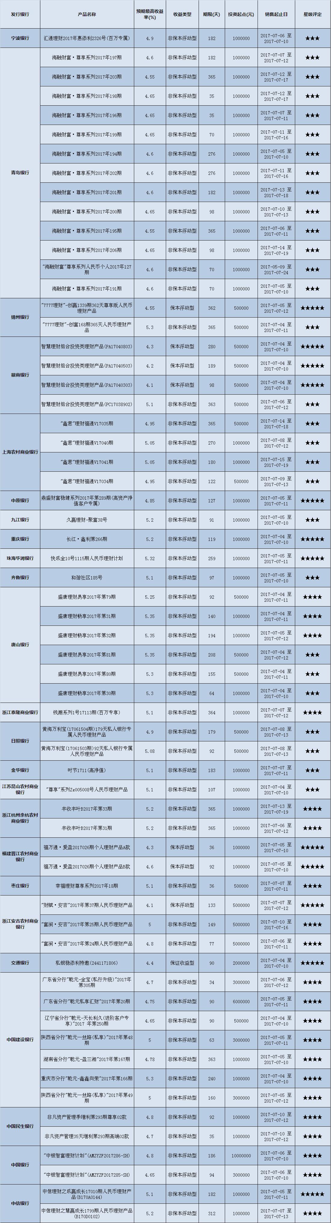 本周在售产品1352款,平均预期收益为4.58%,较上期下降0.05个百分点。其中有1013款获得普益标准星级评定,平均预期收益率为4.48%。其中三星产品473款,平均预期收益率为4.80%;四星产品339款,平均预期收益率为4.12%;五星产品201款,平均预期收益率为4.33%。本期获得四星五星的产品大多是保本型产品,因而平均收益率低于三星产品。