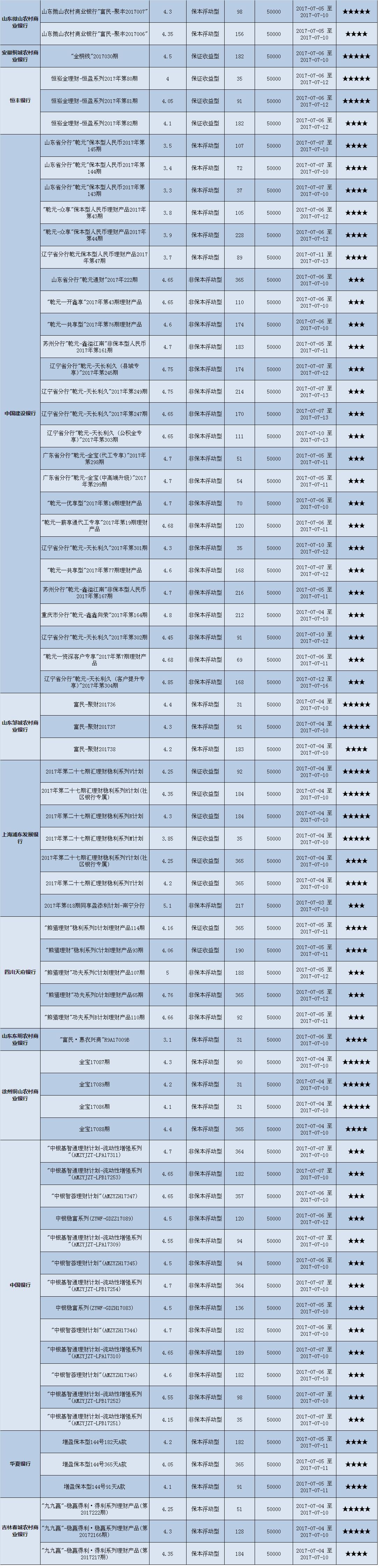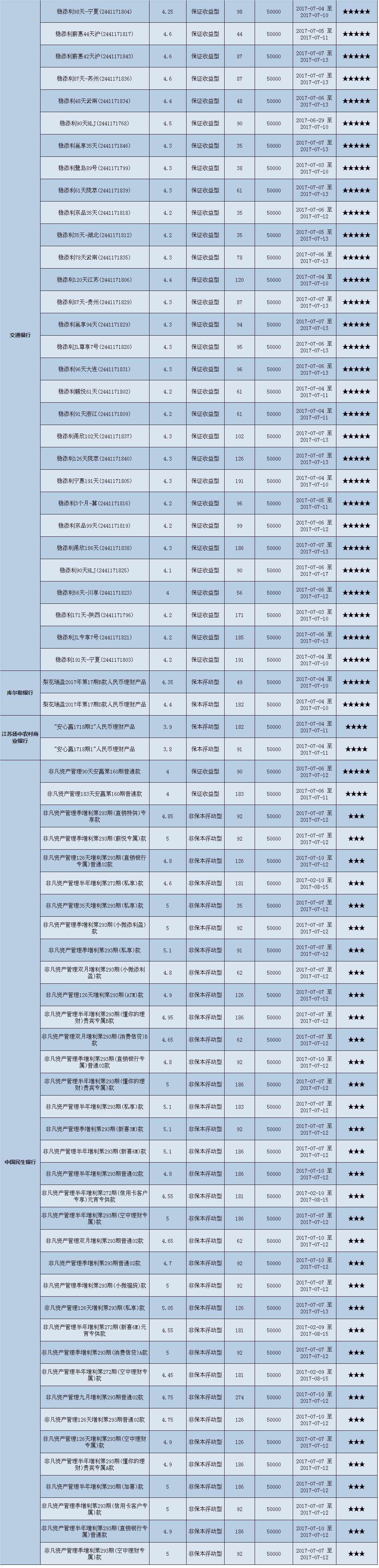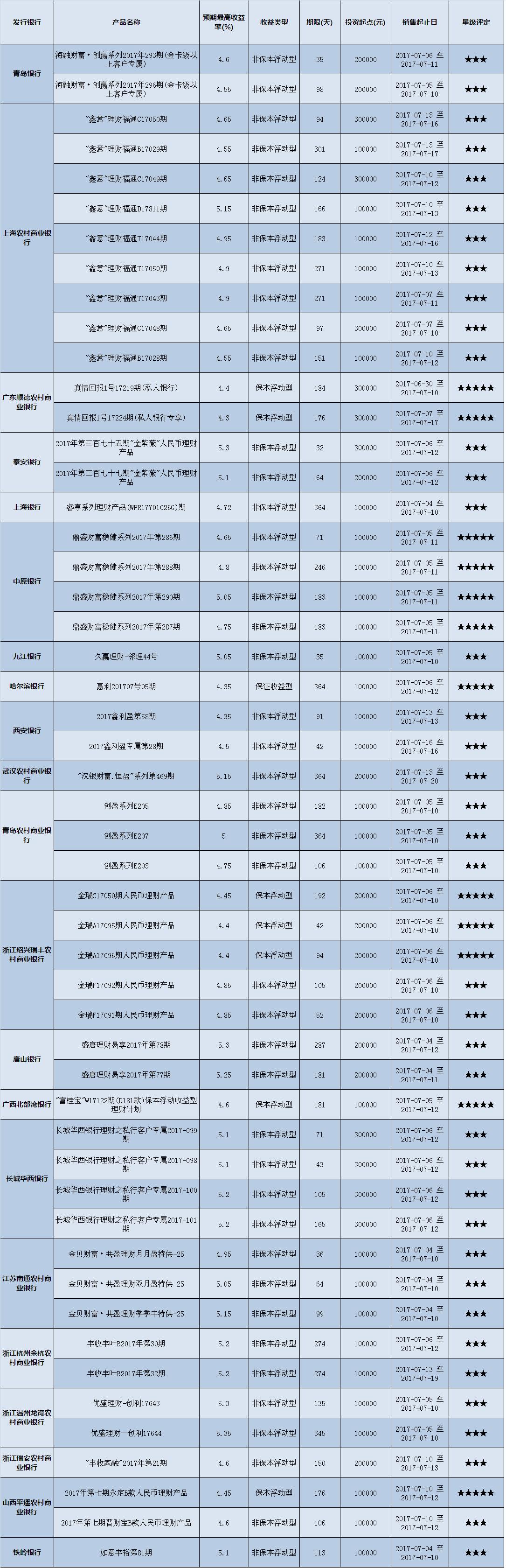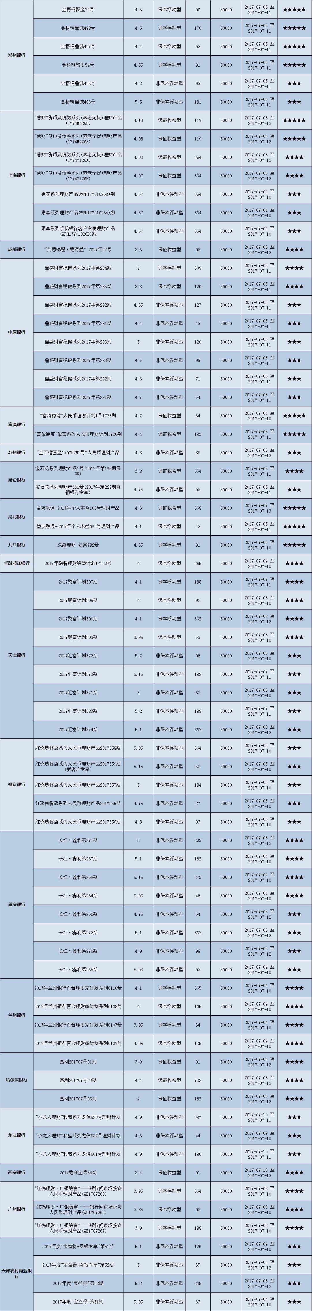 本周在售产品1352款,平均预期收益为4.58%,较上期下降0.05个百分点。其中有1013款获得普益标准星级评定,平均预期收益率为4.48%。其中三星产品473款,平均预期收益率为4.80%;四星产品339款,平均预期收益率为4.12%;五星产品201款,平均预期收益率为4.33%。本期获得四星五星的产品大多是保本型产品,因而平均收益率低于三星产品。