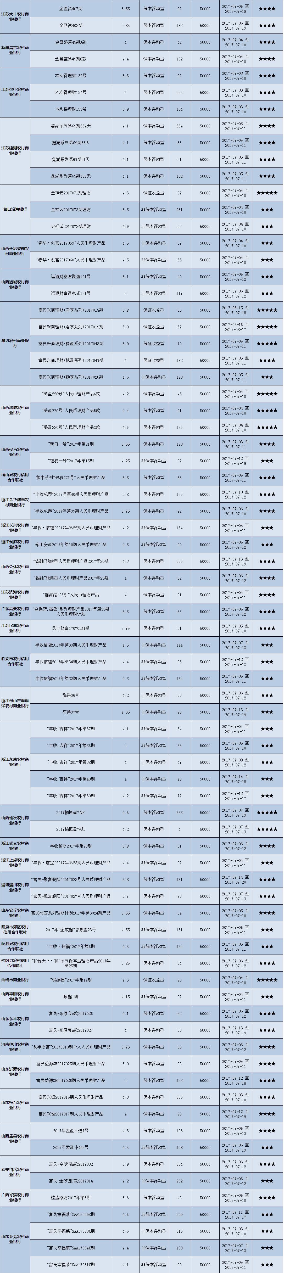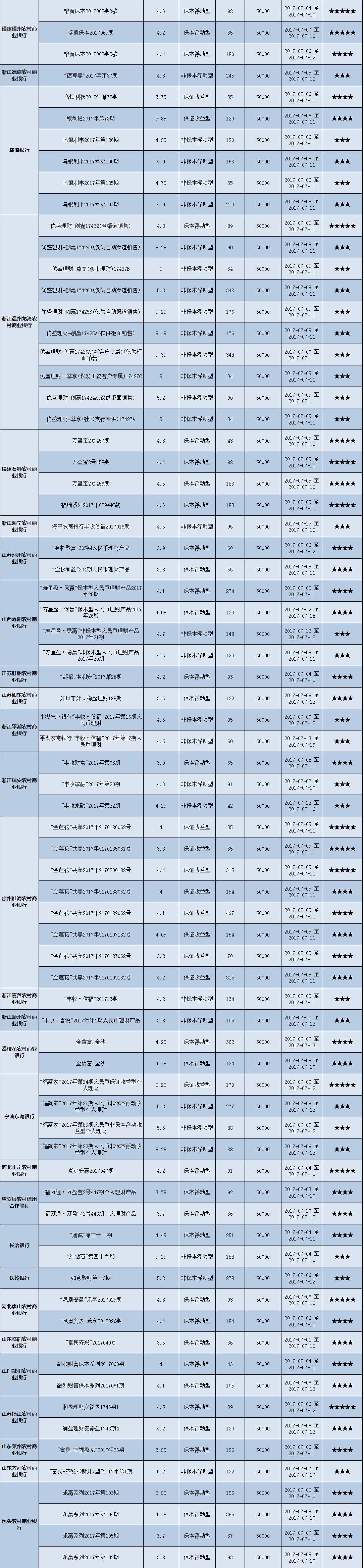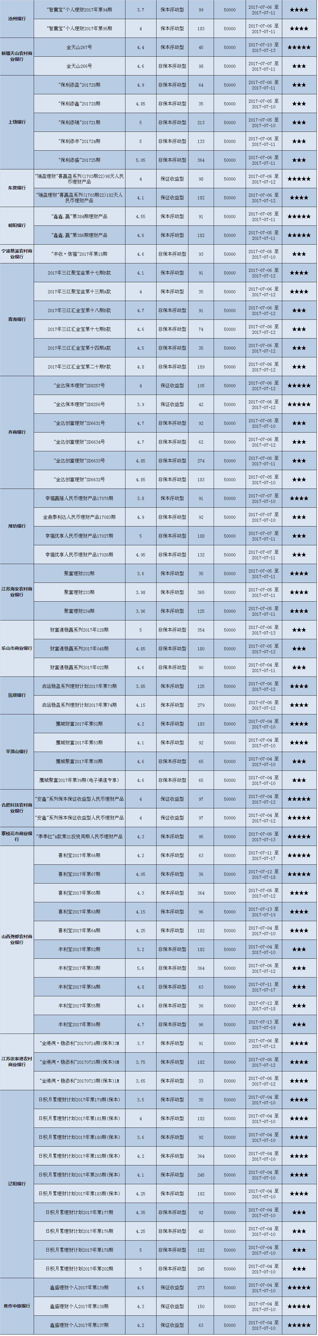 本周投资门槛在10万元至50万元(不含)的产品有139款,平均预期收益为4.82%。其中有104款获得普益标准星级评定,平均预期收益率为4.75%。其中三星产品49款,平均预期收益率为4.90%;四星产品35款,平均预期收益率为4.71%;五星产品20款,平均预期收益率为4.44%。