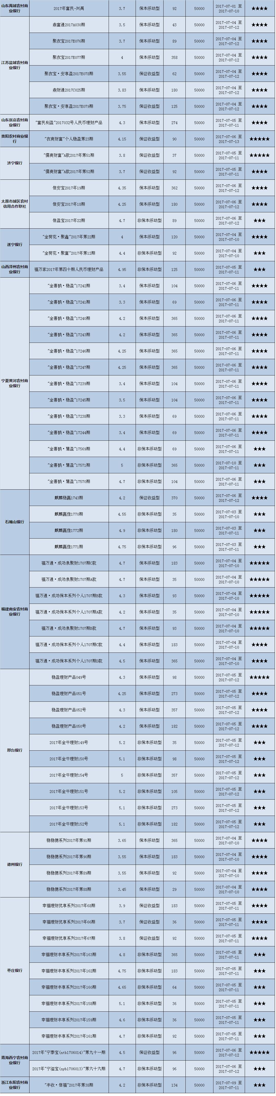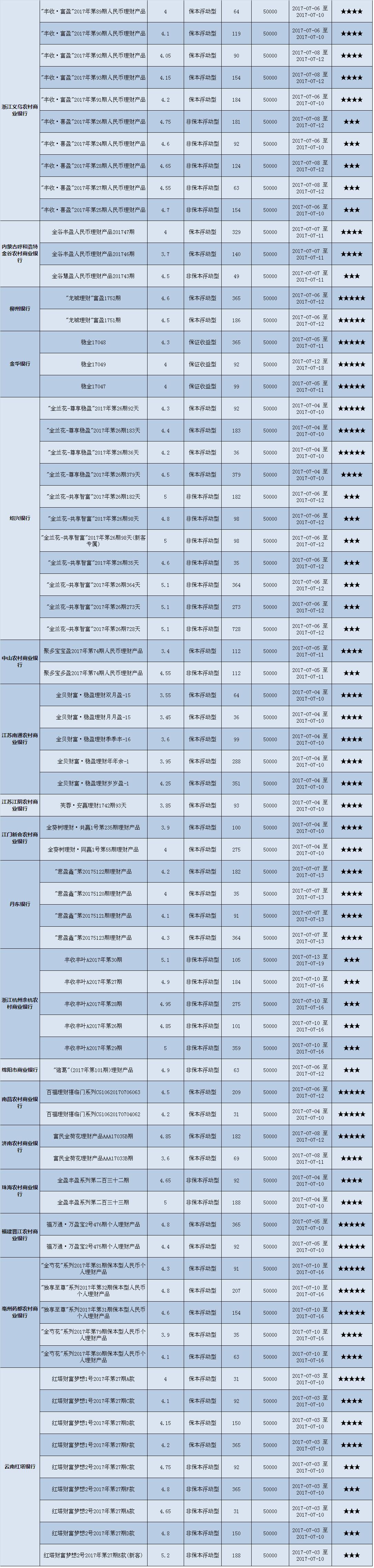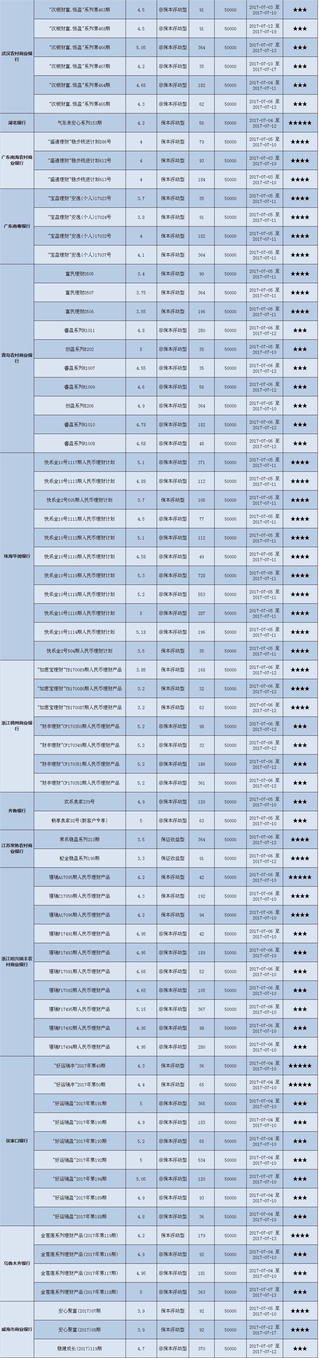 本周投资门槛在10万元至50万元(不含)的产品有139款,平均预期收益为4.82%。其中有104款获得普益标准星级评定,平均预期收益率为4.75%。其中三星产品49款,平均预期收益率为4.90%;四星产品35款,平均预期收益率为4.71%;五星产品20款,平均预期收益率为4.44%。