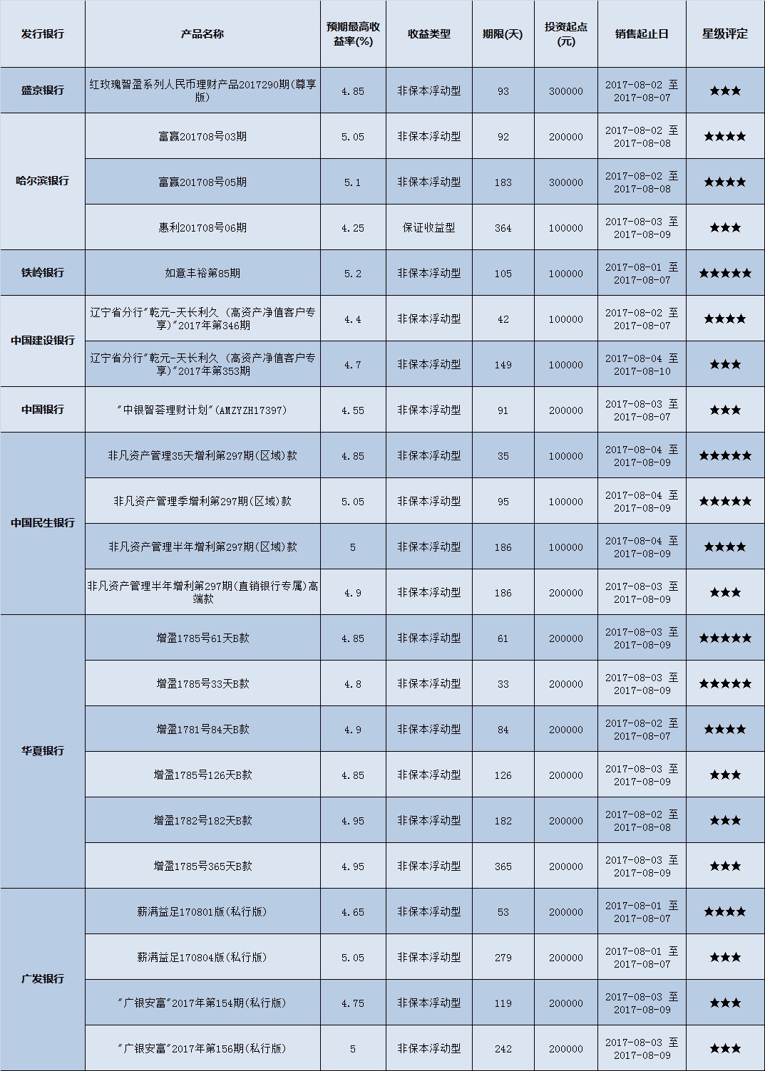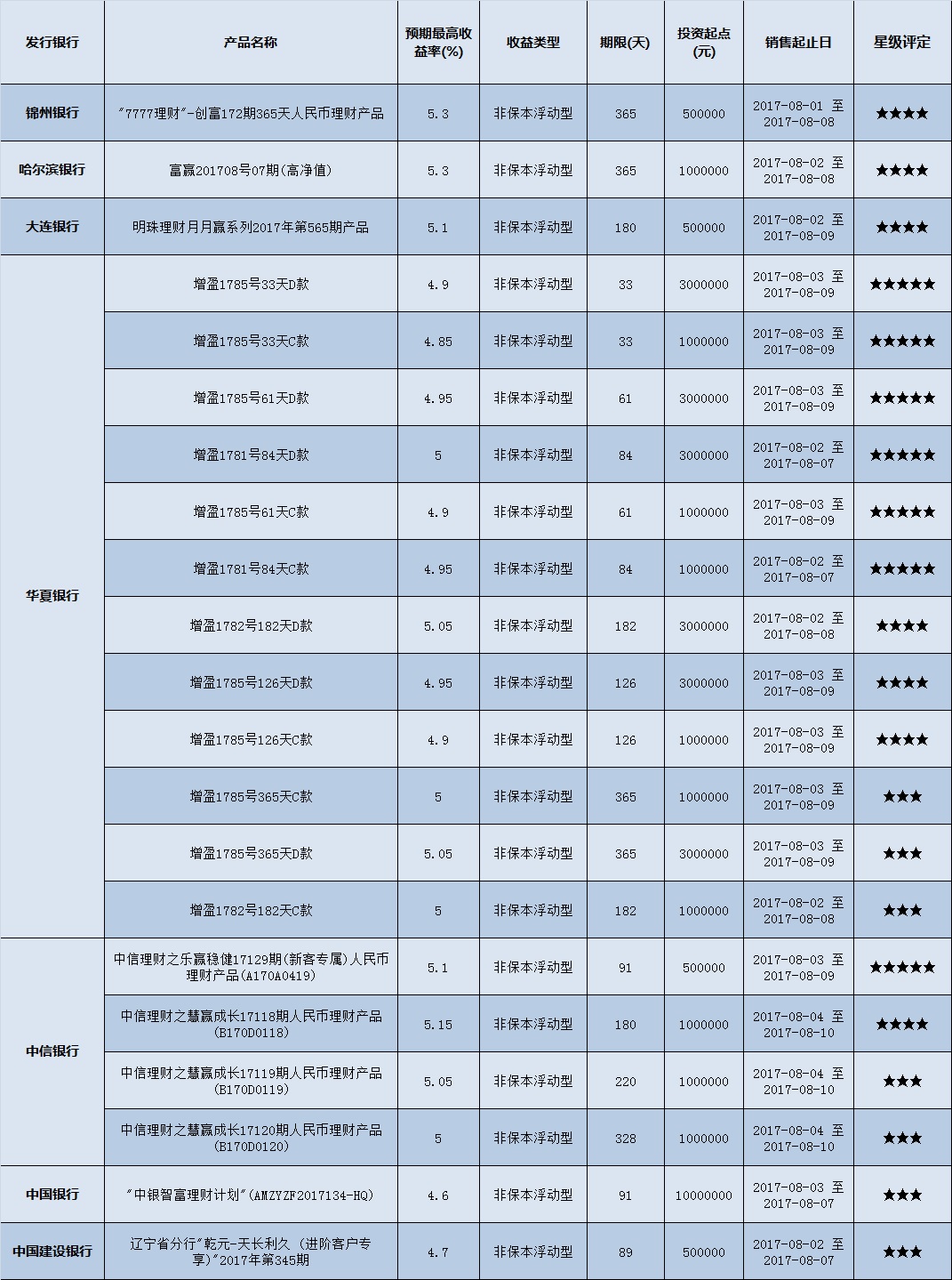 高门槛(50万元及以上)的理财产品中,东北地区有21款获得普益标准星级评定,平均预期收益率为4.99%。其中三星产品7款,平均预期收益率为4.91%;四星产品7款,平均预期收益率为5.11%;五星产品7款,平均预期收益率为4.95%。