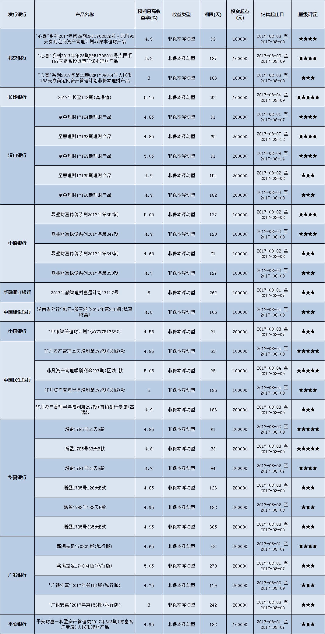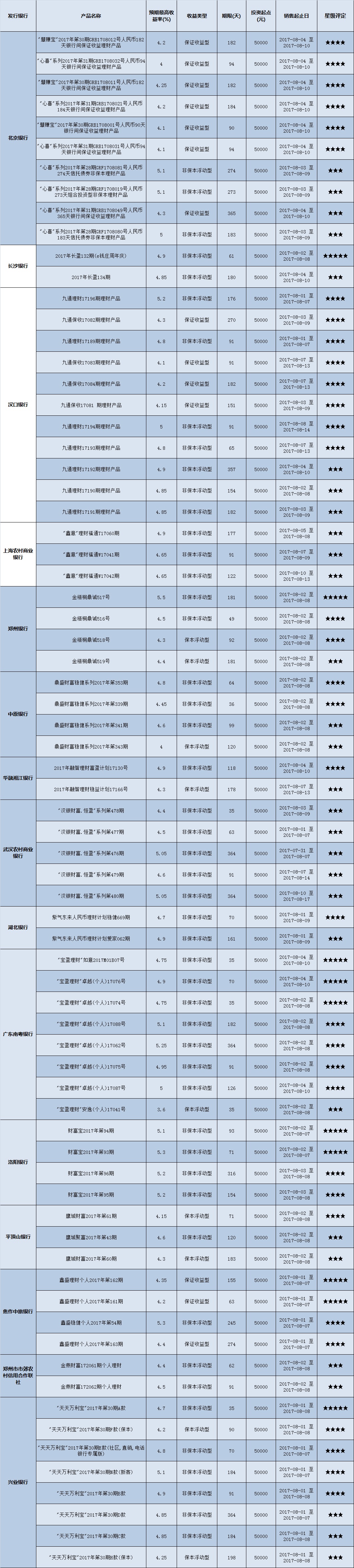 高门槛(50万元及以上)的理财产品中,华中地区有20款获得普益标准星级评定,平均预期收益率为4.98%。其中三星产品7款,平均预期收益率为4.96%;四星产品6款,平均预期收益率为5.04%;五星产品7款,平均预期收益率为4.95%。