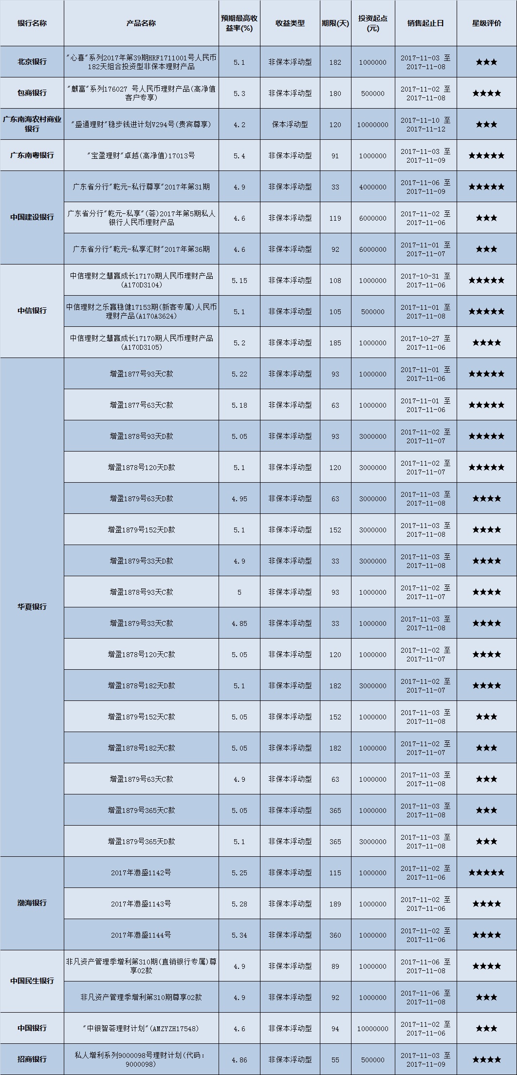 高门槛(50万元及以上)的理财产品中,华南地区有33款获得普益标准星级评定,平均预期收益率为5.01%。其中三星产品11款,平均预期收益率为4.83%;四星产品13款,平均预期收益率为5.06%;五星产品9款,平均预期收益率为5.15%。