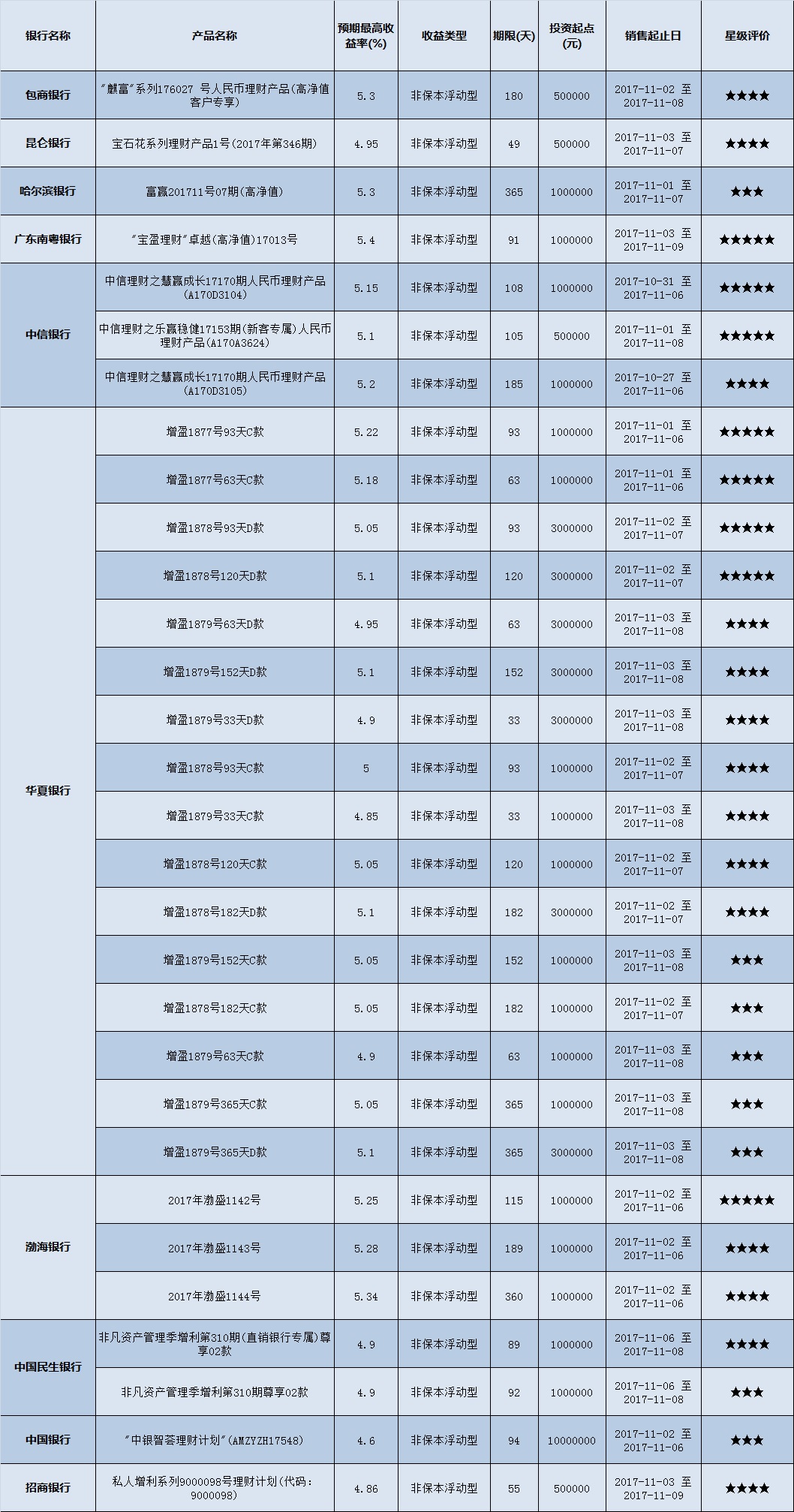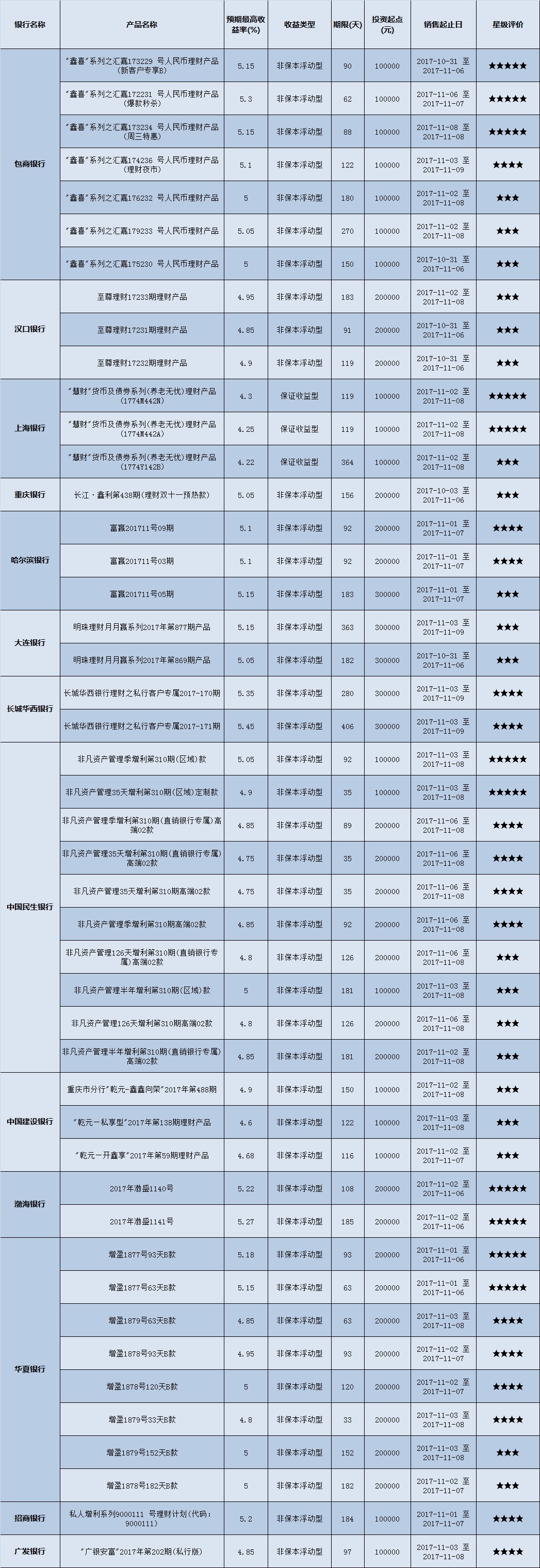 高门槛(50万元及以上)的理财产品中,西南地区有30款获得普益标准星级评定,平均预期收益率为5.07%。其中三星产品8款,平均预期收益率为4.99%;四星产品14款,平均预期收益率为5.06%;五星产品8款,平均预期收益率为5.18%。