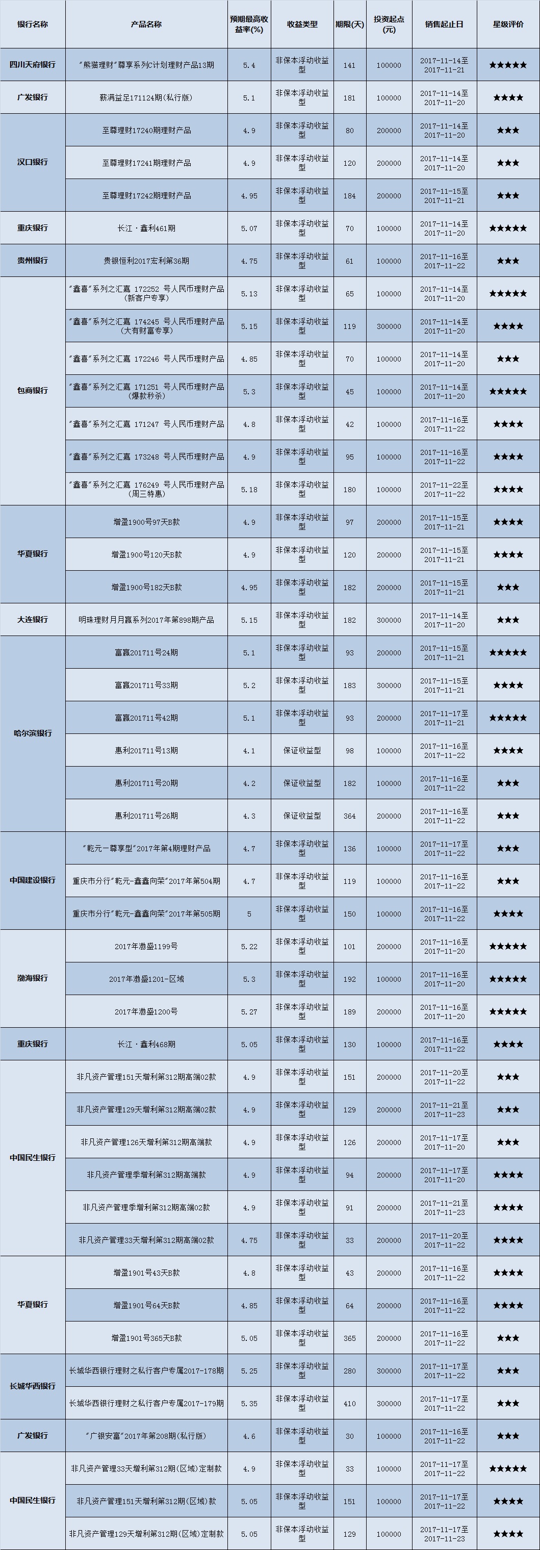 高门槛(50万元及以上)的理财产品中,西南地区有26款获得普益标准星级评定,平均预期收益率为5.05%。其中三星产品10款,平均预期收益率为5.03%;四星产品11款,平均预期收益率为5.04%;五星产品5款,平均预期收益率为5.11%。