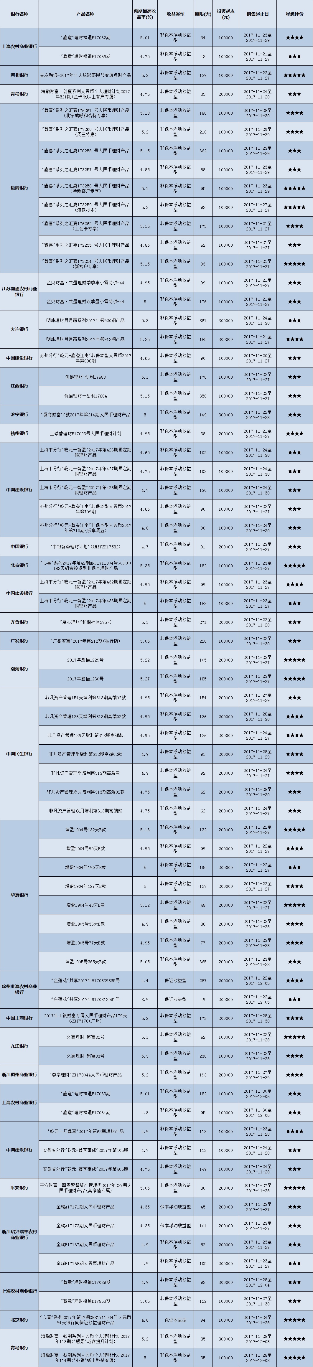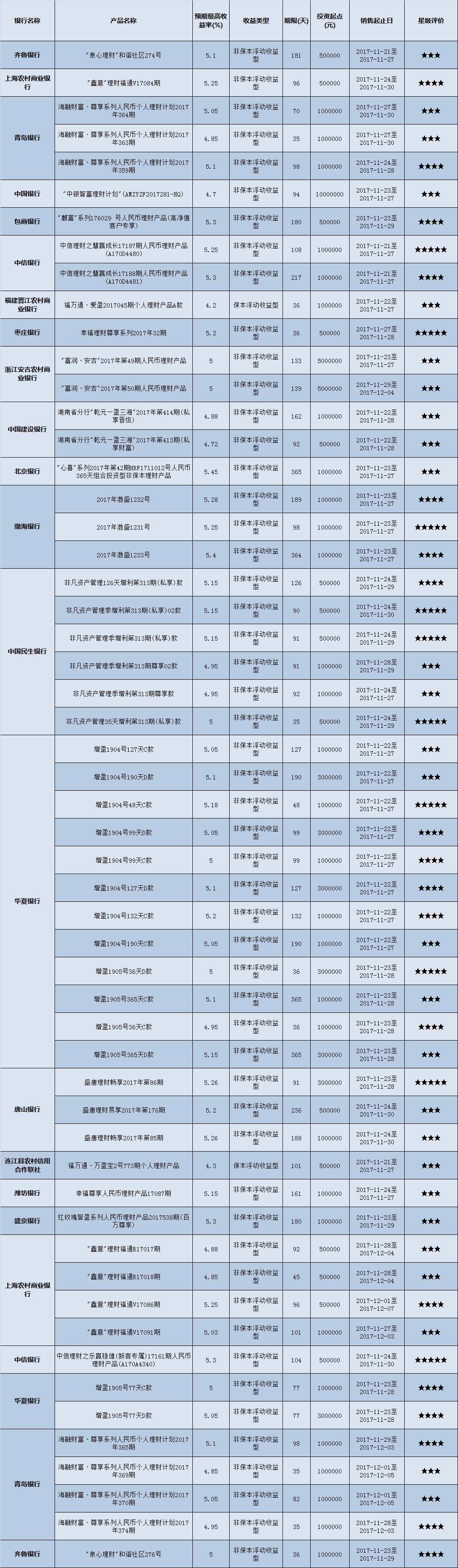 高门槛(50万元及以上)的理财产品中,华东地区有55款获得普益标准星级评定,平均预期收益率为5.06%。其中三星产品27款,平均预期收益率为4.97%;四星产品18款,平均预期收益率为5.13%;五星产品10款,平均预期收益率为5.17%。