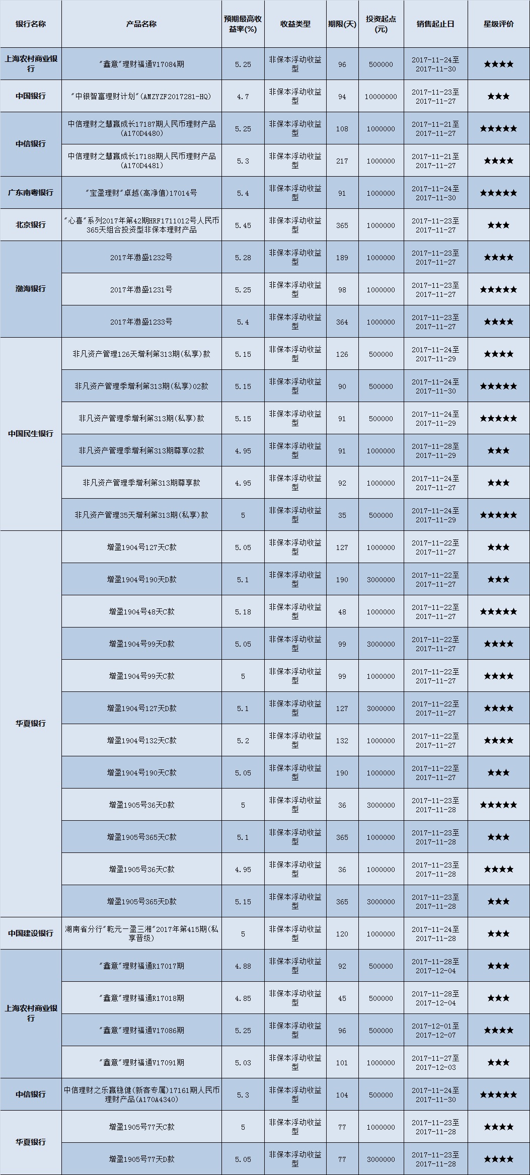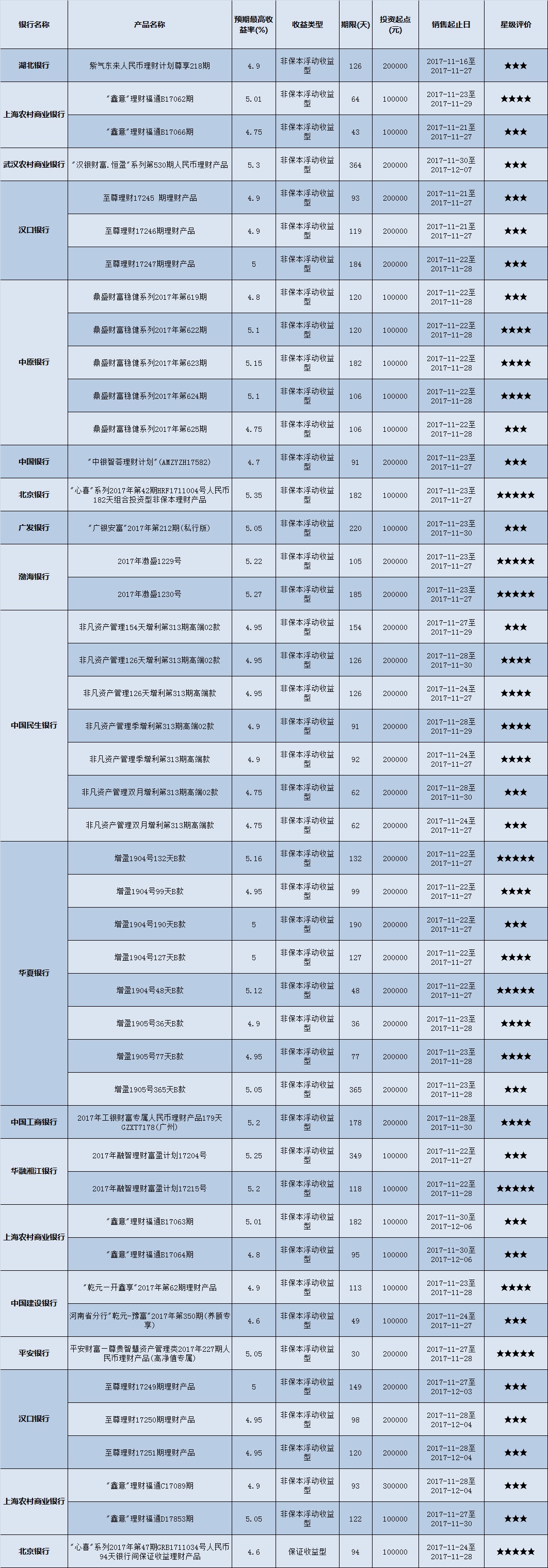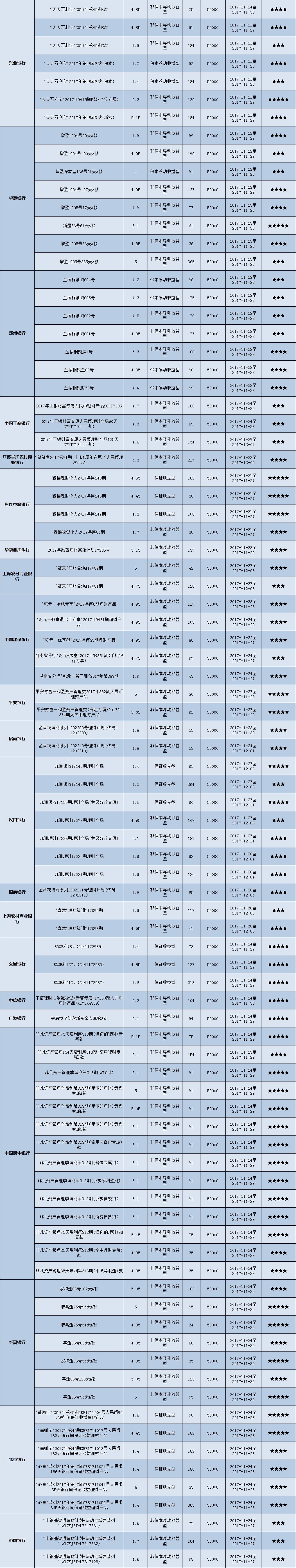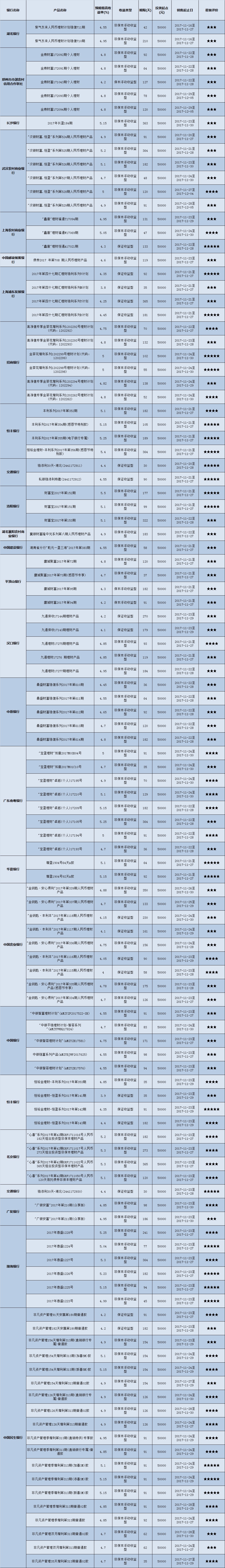 高门槛(50万元及以上)的理财产品中,华中地区有35款获得普益标准星级评定,平均预期收益率为5.11%。其中三星产品13款,平均预期收益率为5.02%;四星产品13款,平均预期收益率为5.15%;五星产品9款,平均预期收益率为5.19%。