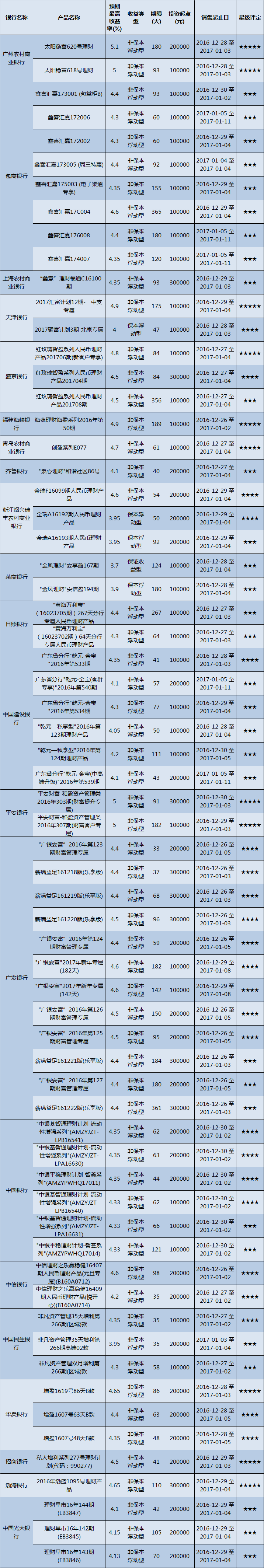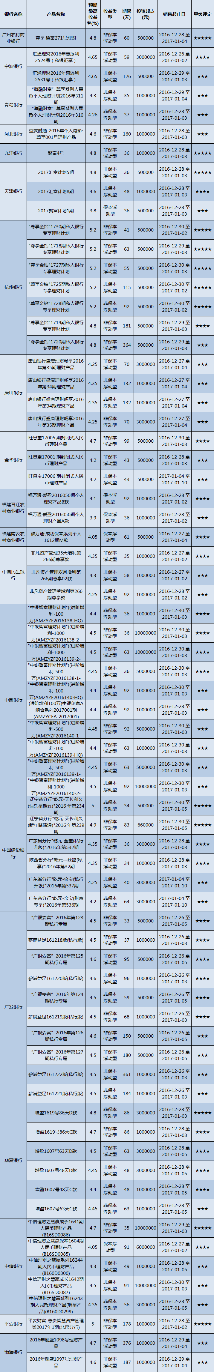 高门槛(50万元及以上)的理财产品中,华东地区有70款获得普益标准星级评定,平均预期收益率为4.52%。其中三星产品33款,平均预期收益率为4.38%;四星产品24款,平均预期收益率为4.46%;五星产品13款,平均预期收益率为4.98%。