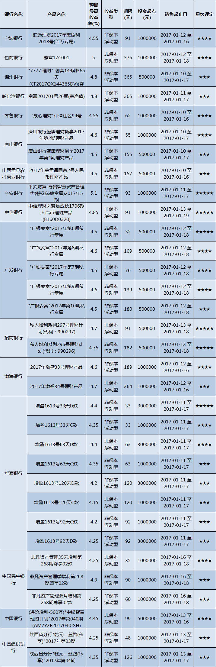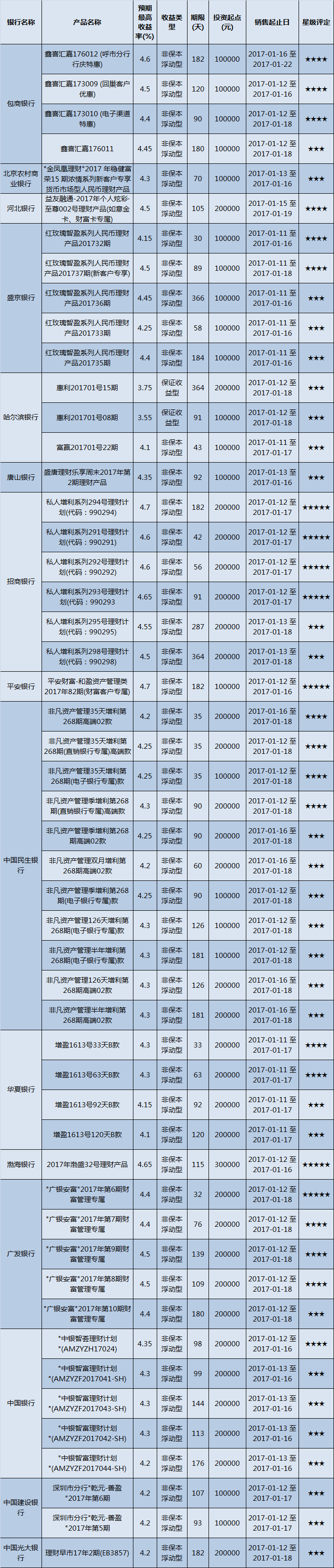 高门槛(50万元及以上)的理财产品中,华北地区有33款获得普益标准星级评定,平均预期收益率为4.51%。其中三星产品15款,平均预期收益率为4.41%;四星产品12款,平均预期收益率为4.54%;五星产品6款,平均预期收益率为4.72%。