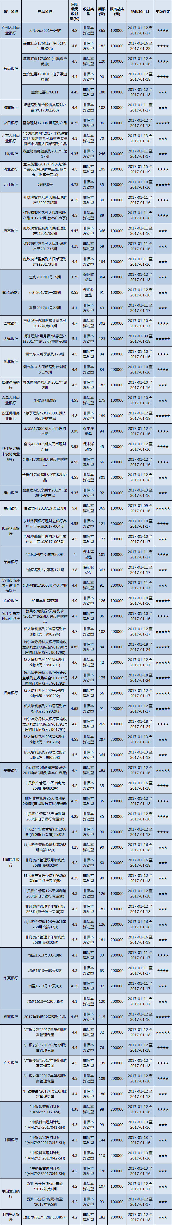 本周投资门槛在10万元以下的产品有926款,平均预期收益为4.05%。其中有694款获得普益标准星级评定,平均预期收益率为4.21%。其中三星产品324款,平均预期收益率为4.04%;四星产品232款,平均预期收益率为4.29%;五星产品138款,平均预期收益率为4.49%。