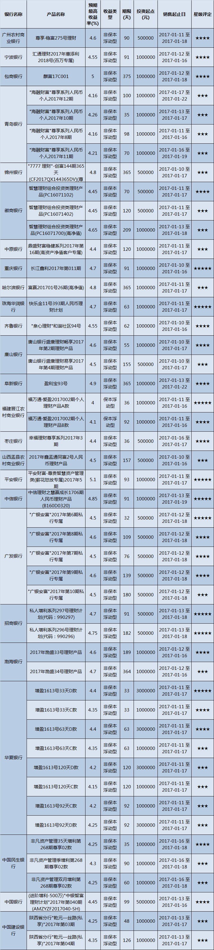 本周投资门槛在10万元至50万元(不含)的产品有105款,平均预期收益为4.32%。其中有78款获得普益标准星级评定,平均预期收益率为4.42%,较上期下降了0.08个百分点。其中三星产品36款,平均预期收益率为4.28%;四星产品27款,平均预期收益率为4.40%;五星产品15款,平均预期收益率为4.78%。
