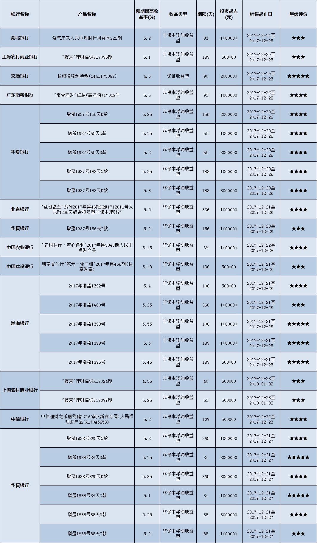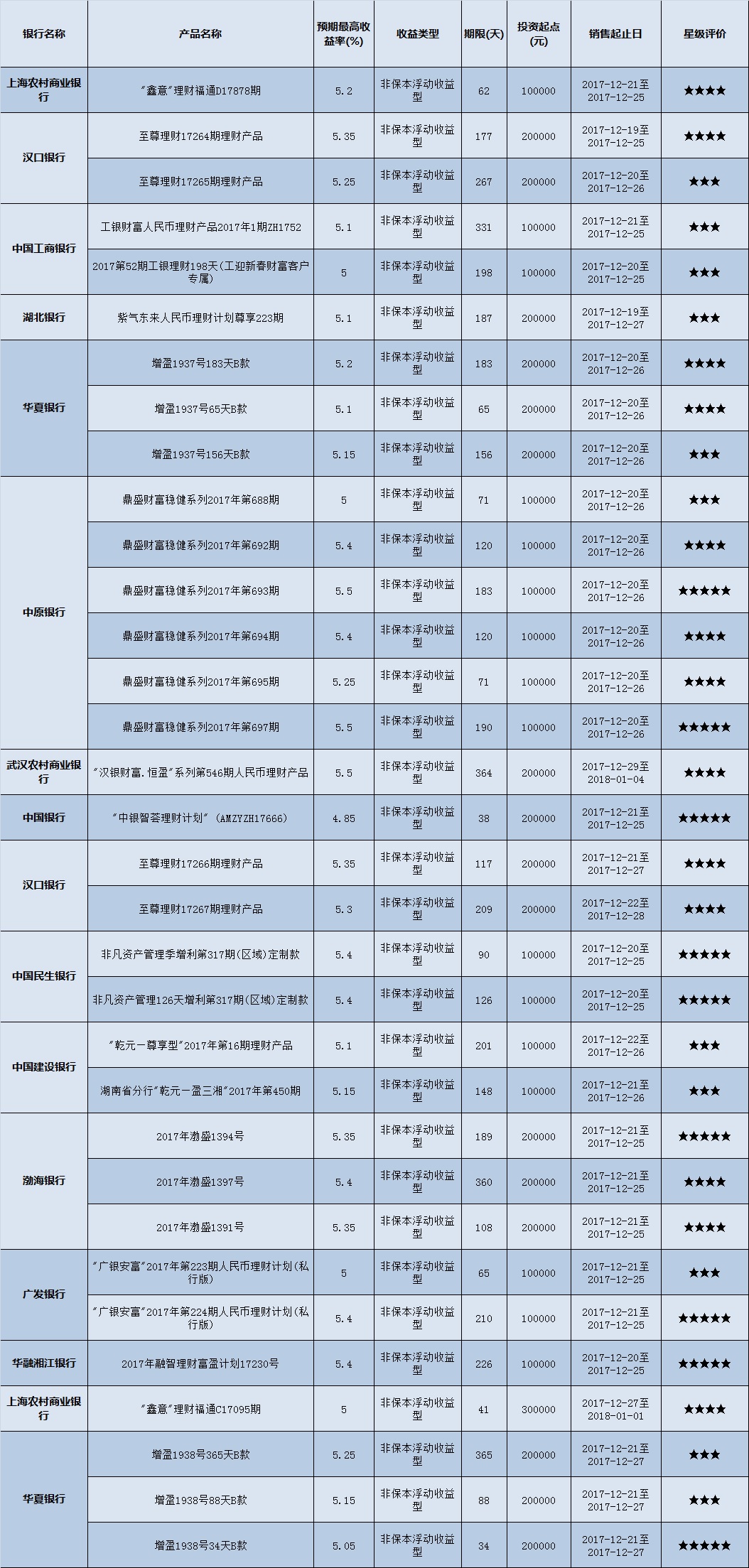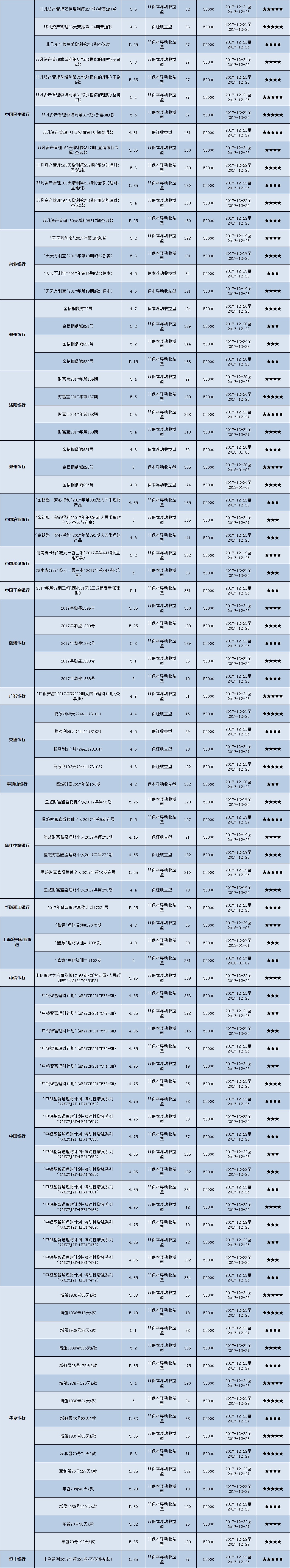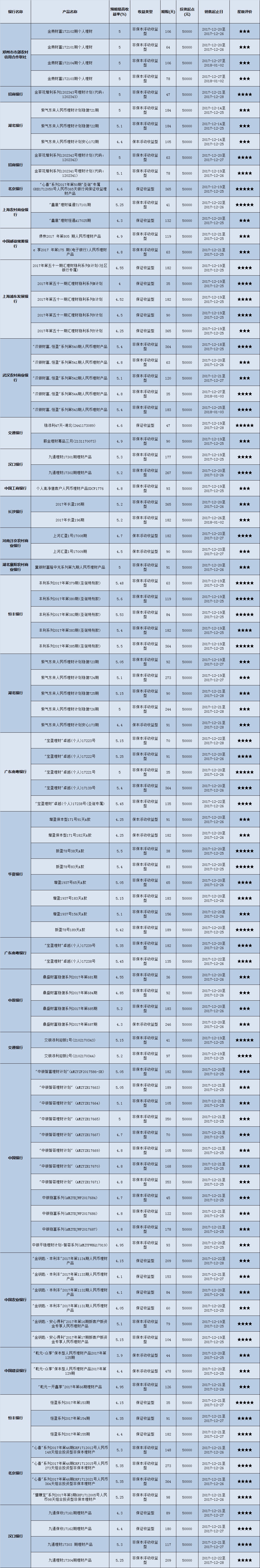高门槛(50万元及以上)的理财产品中,华中地区有27款获得普益标准星级评价,平均预期收益率为5.24%。其中三星产品8款,平均预期收益率为5.15%;四星产品13款,平均预期收益率为5.3%;五星产品6款,平均预期收益率为5.22%。