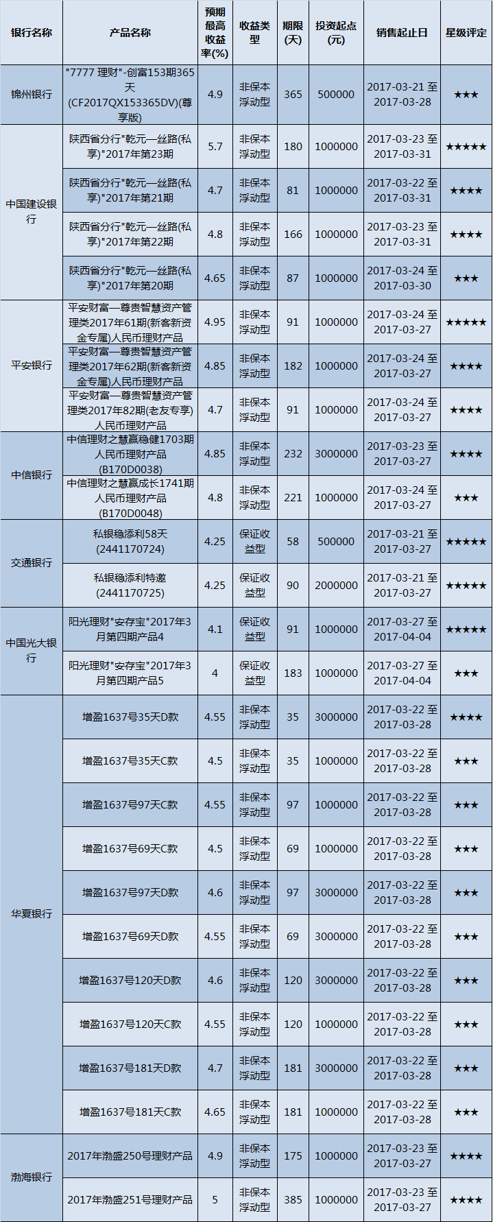 高门槛(50万元及以上)的理财产品中,东北地区有26款获得普益标准星级评定,平均预期收益率为4.66%。其中三星产品13款,平均预期收益率为4.58%;四星产品8款,平均预期收益率为4.79%;五星产品5款,平均预期收益率为4.65%。