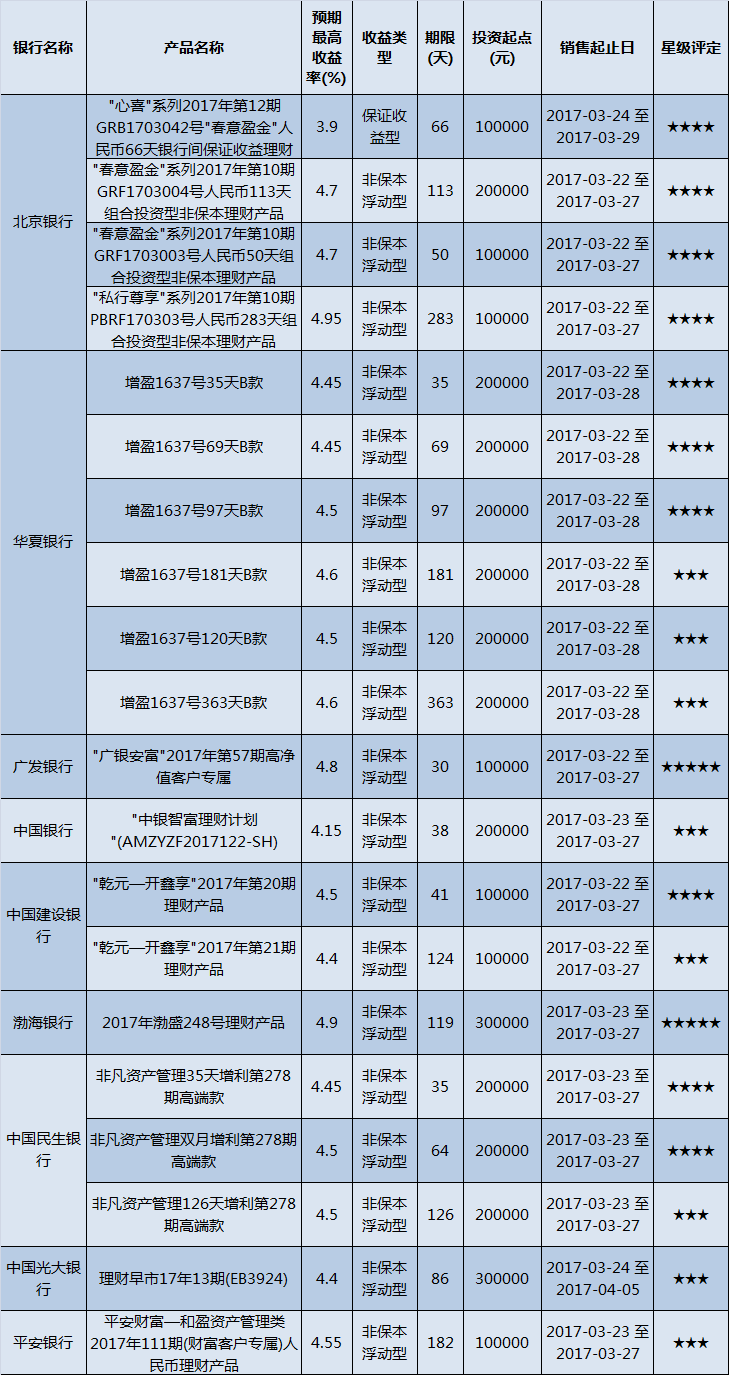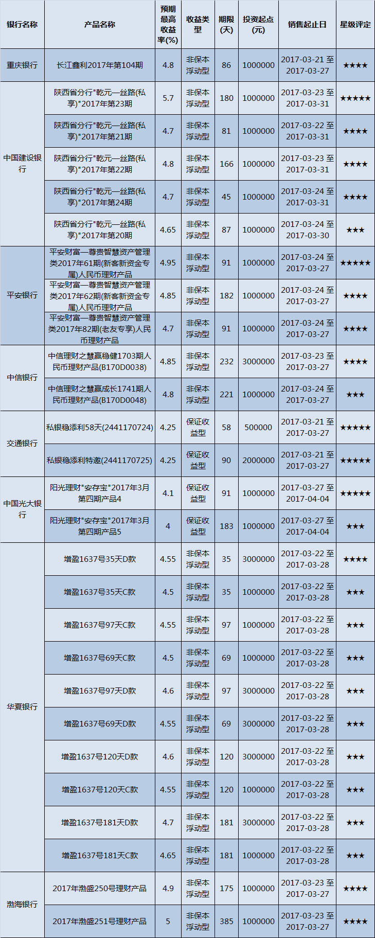高门槛(50万元及以上)的理财产品中,西北地区有27款获得普益标准星级评定,平均预期收益率为4.66%。其中三星产品12款,平均预期收益率为4.55%;四星产品10款,预期收益率为4.79%;五星产品5款,预期收益率为4.65%。