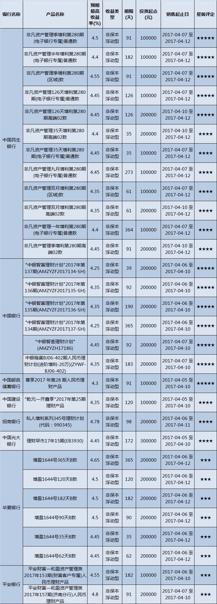 低门槛(10万元以下)理财产品中,西北地区有195款获得普益标准星级评定,平均预期收益率为4.46%。其中三星产品75款,平均预期收益率为4.45%;四星产品38款,平均预期收益率4.49%;五星产品82款,平均预期收益率为4.45%。