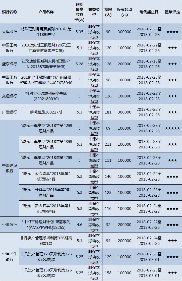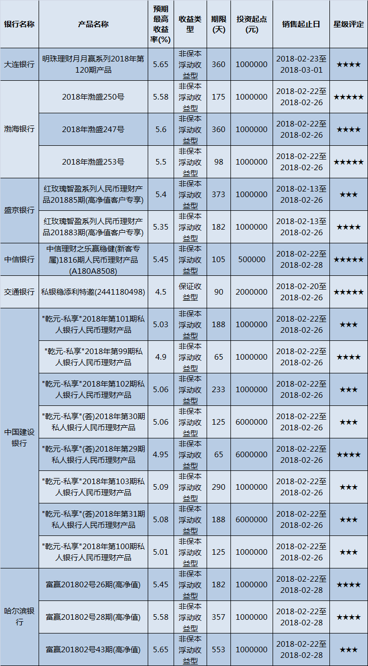 高门槛(50万元及以上)的理财产品中,东北地区有18款获得普益标准星级评定,平均预期收益率为5.33%。其中三星产品10款,平均预期收益率为5.32%;四星产品6款,平均预期收益率为5.29%;五星产品2款,平均预期收益率为5.47%。