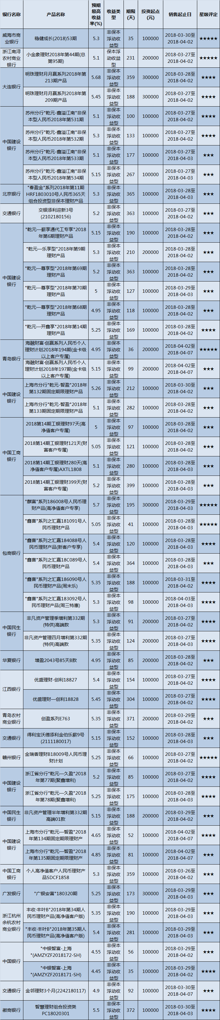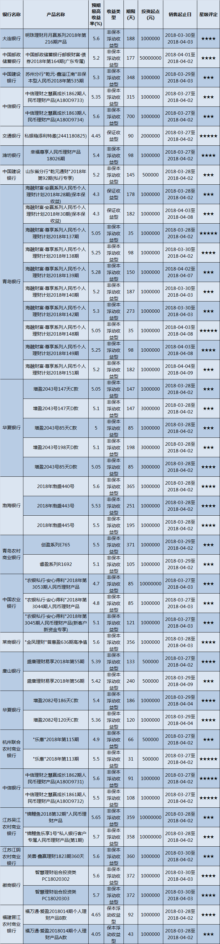 高门槛(50万元及以上)的理财产品中,华东地区有47款获得普益标准星级评定,平均预期收益率为5.21%。其中三星产品25款,平均预期收益率为5.11%;四星产品16款,平均预期收益率为5.38%;五星产品6款,平均预期收益率为5.19%。