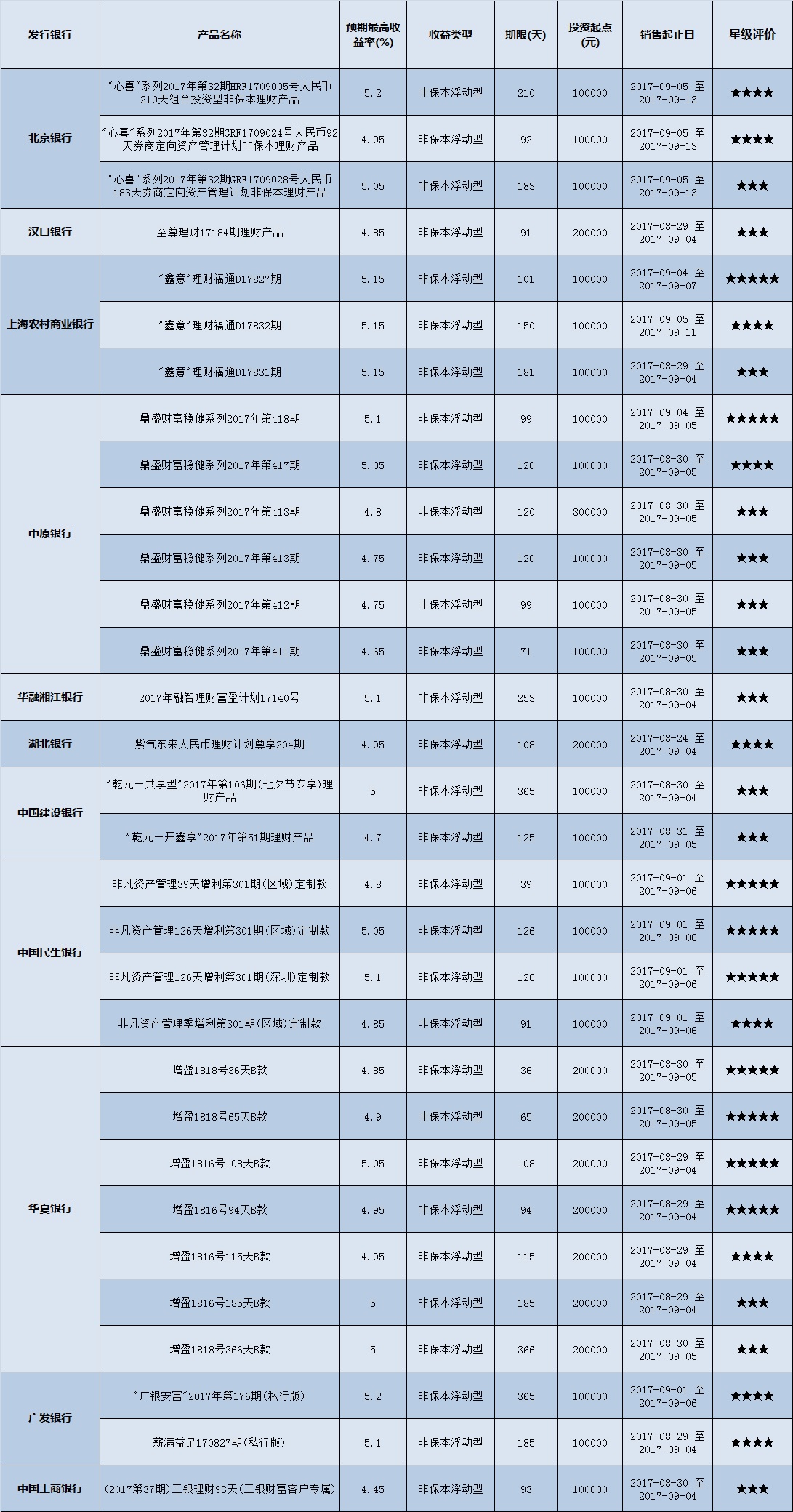 低门槛(10万元以下)理财产品中,华中地区有146款获得普益标准星级评价,平均预期收益率为4.70%。其中三星产品55款,平均预期收益率为4.62%;四星产品59款,平均预期收益率4.69%;五星产品32款,平均预期收益率为4.84%。