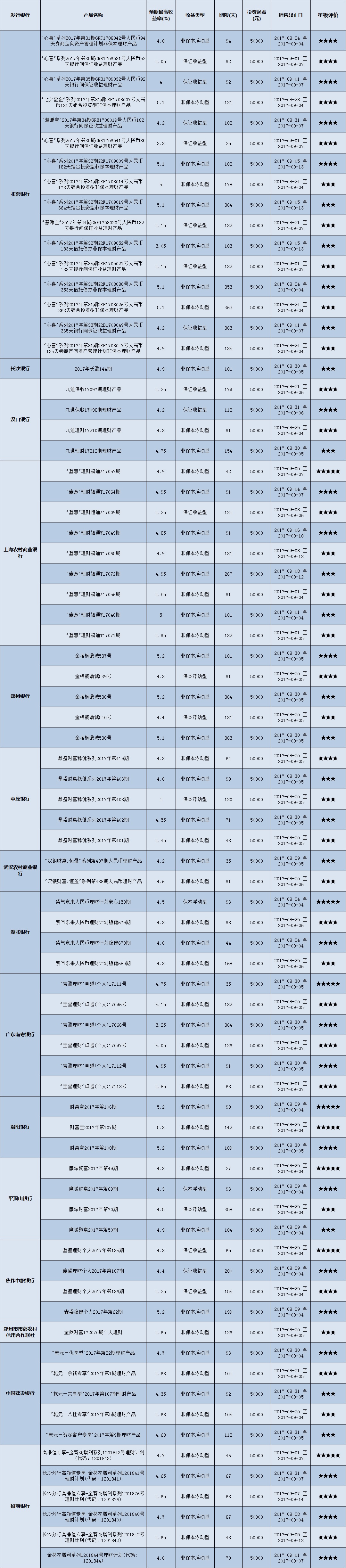 高门槛(50万元及以上)的理财产品中,华中地区有29款获得普益标准星级评价,平均预期收益率为4.95%。其中三星产品12款,平均预期收益率为4.94%;四星产品9款,平均预期收益率为5.05%;五星产品8款,平均预期收益率为4.86%。