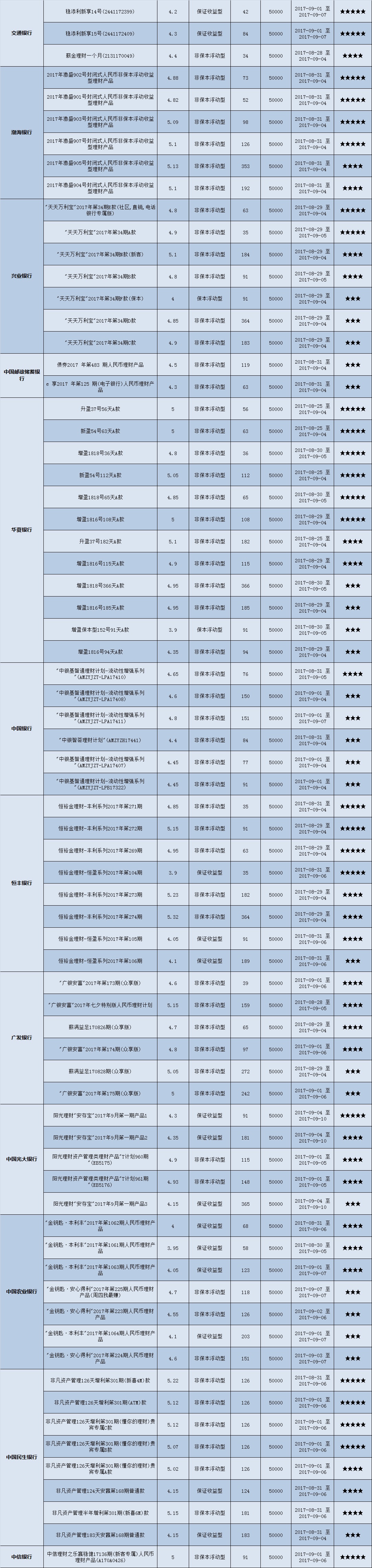 中等门槛(10万元至50万元(不含))的理财产品中,华中地区有31款获得普益标准星级评价,平均预期收益率为4.95%。其中三星产品13款,平均预期收益率为4.87%;四星产品9款,平均预期收益率为5.04%;五星产品9款,平均预期收益率为4.99%。