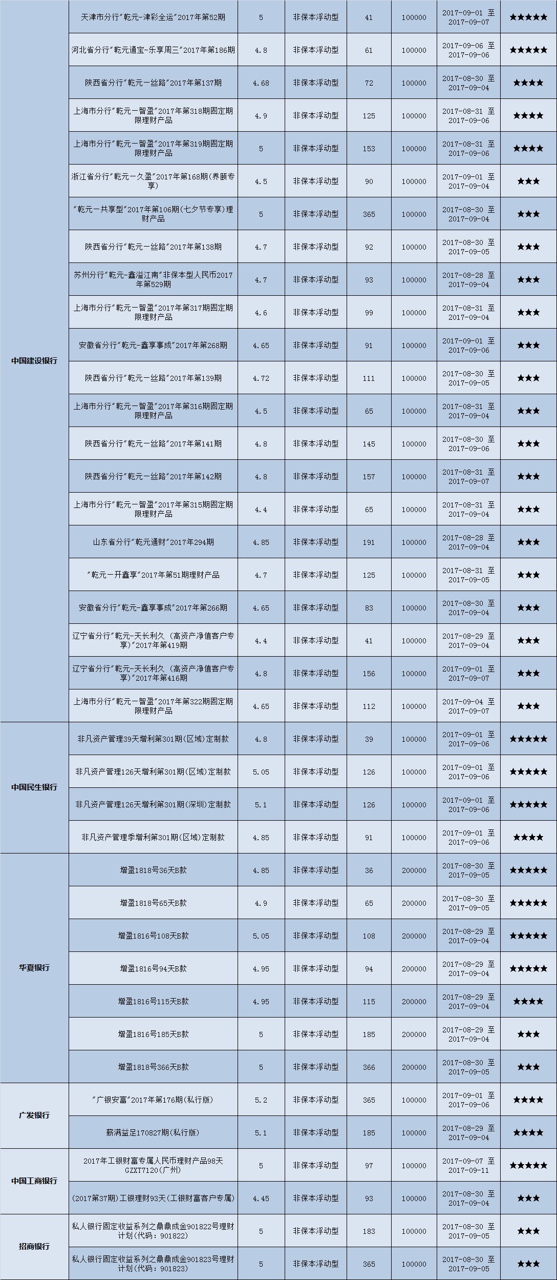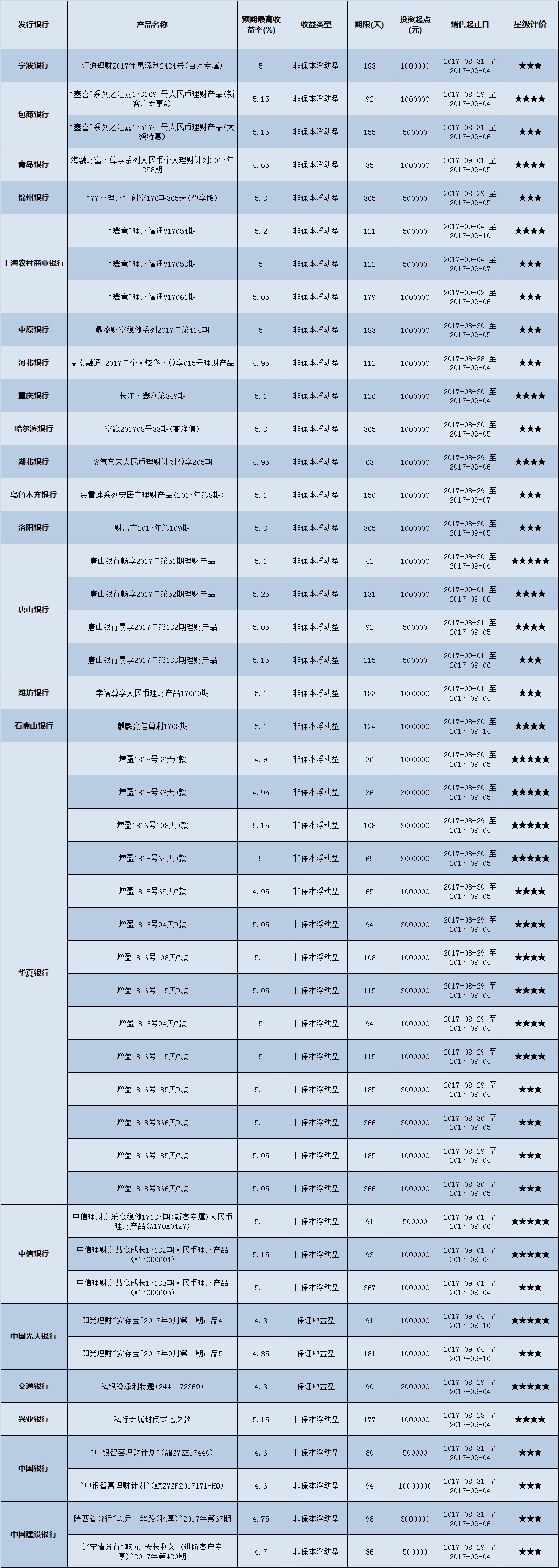 本周投资门槛在10万元以下的产品有955款,平均预期收益为4.54%。其中有716款获得普益标准星级评价,平均预期收益率为4.66%。其中三星产品334款,平均预期收益率为4.59%;四星产品239款,平均预期收益率为4.66%;五星产品143款,平均预期收益率为4.83%。