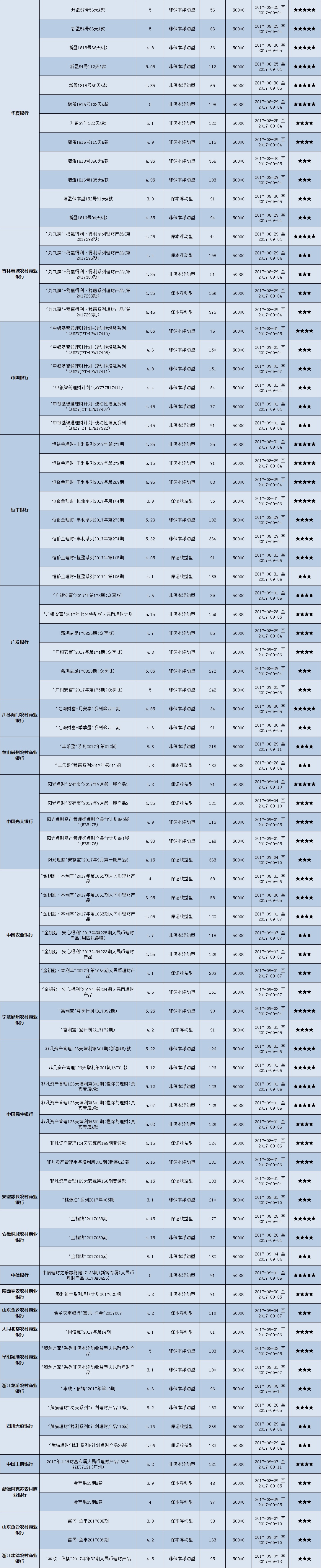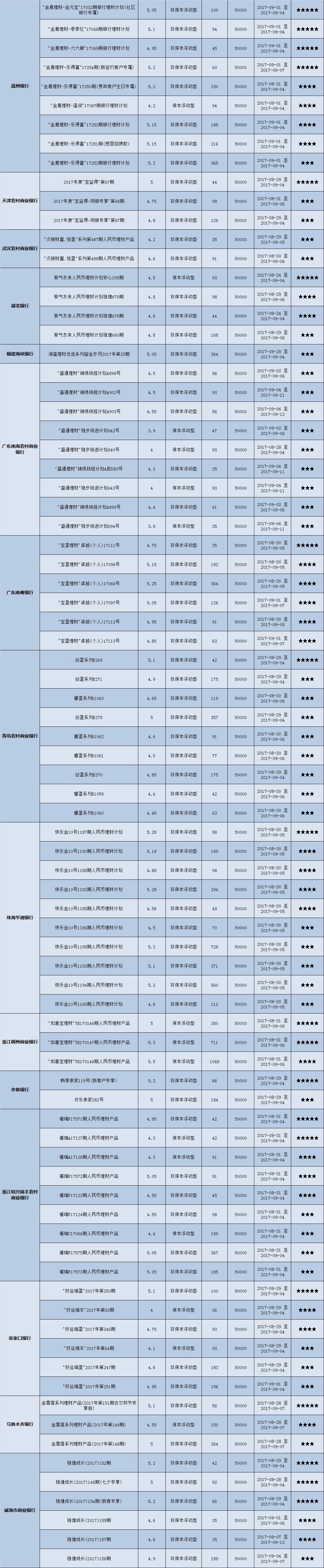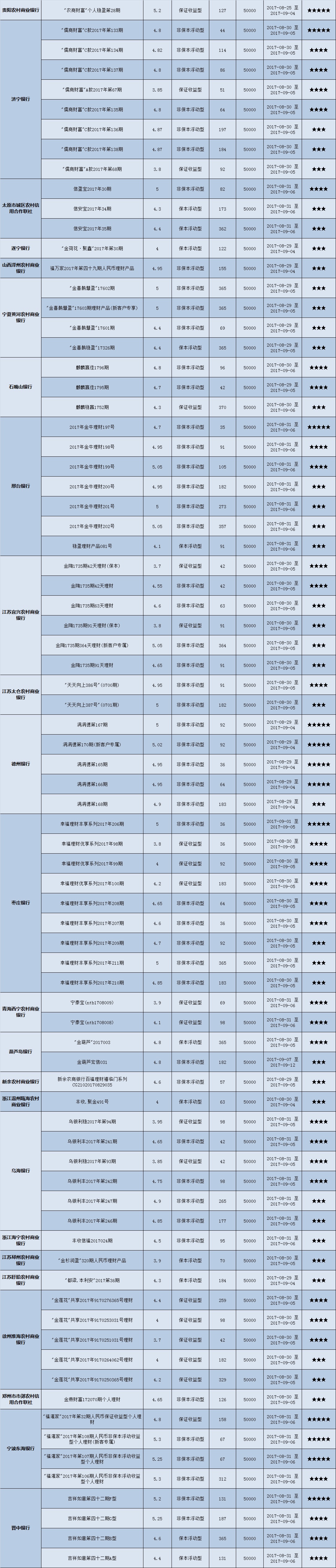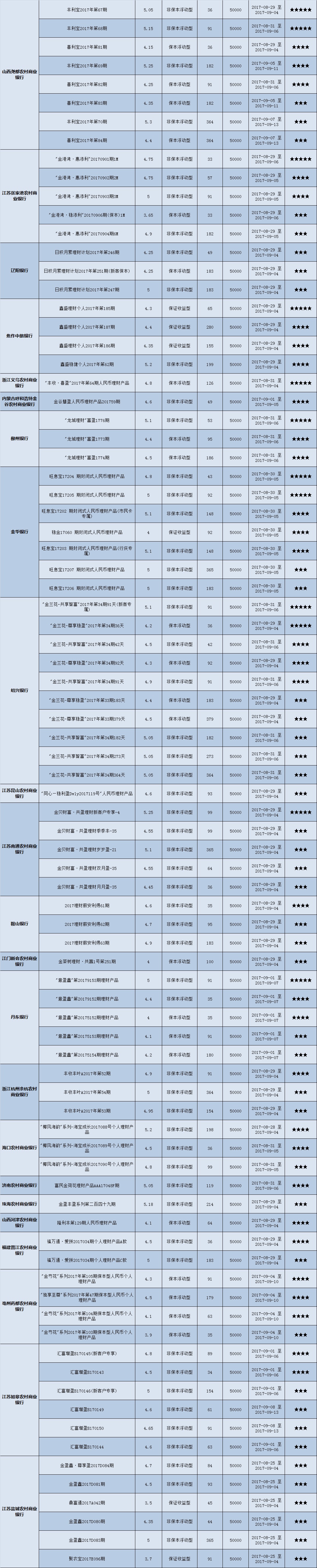 本周投资门槛在10万元至50万元(不含)的产品有122款,平均预期收益为4.79%。其中有91款获得普益标准星级评价,平均预期收益率为4.88%。其中三星产品43款,平均预期收益率为4.81%;四星产品30款,平均预期收益率为4.93%;五星产品18款,平均预期收益率为4.94%。