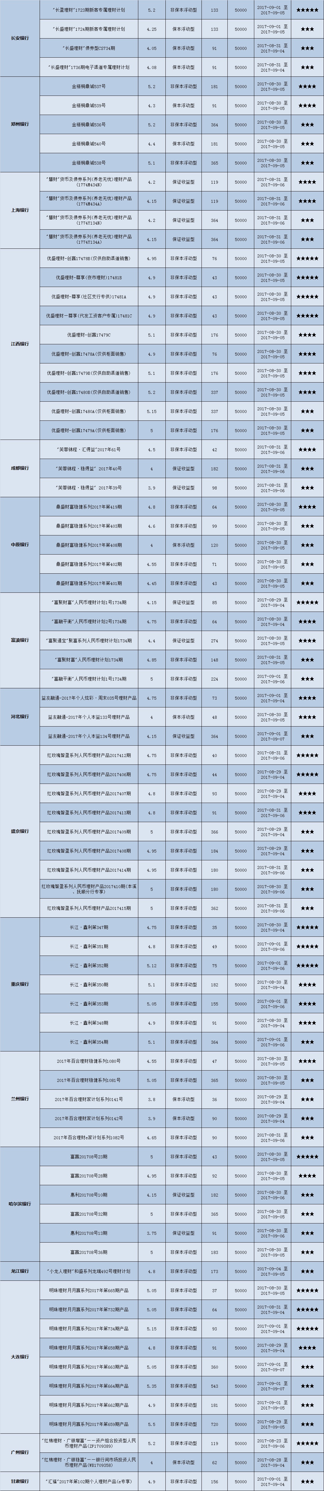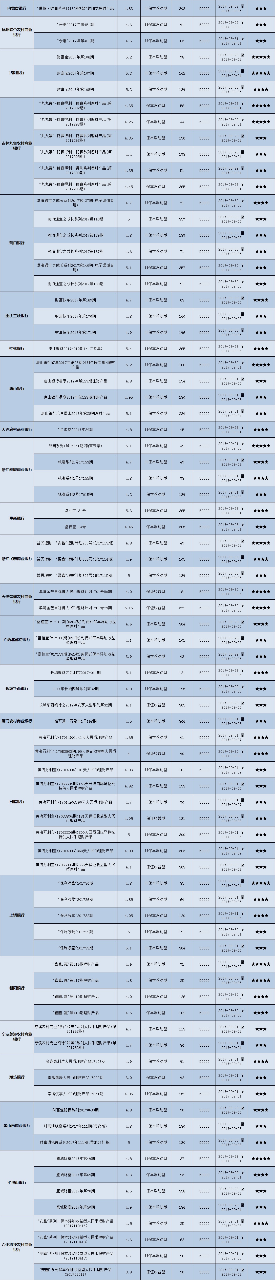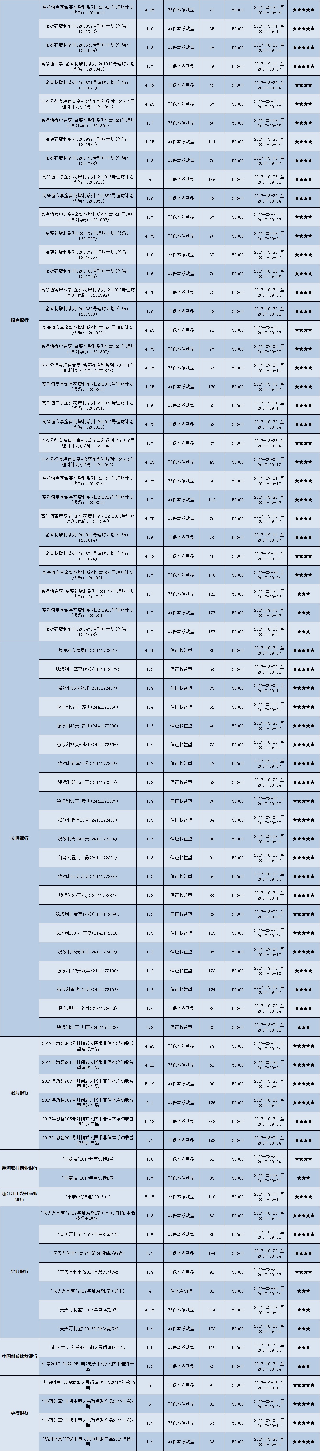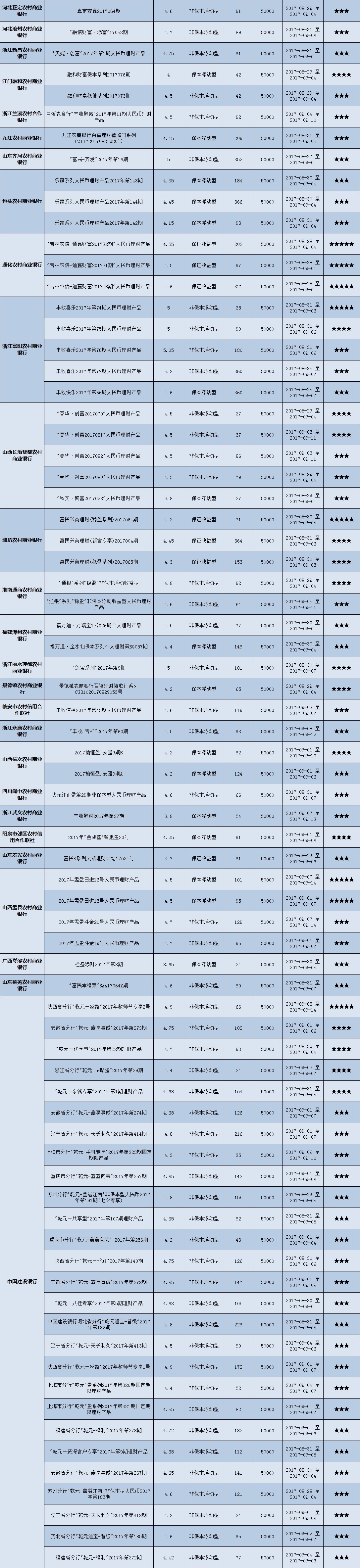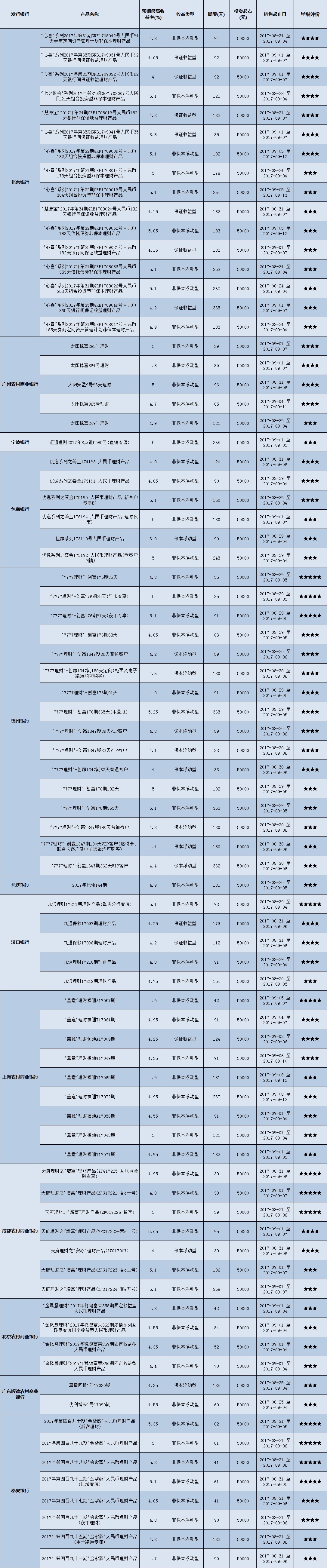 本周投资门槛在10万元至50万元(不含)的产品有122款,平均预期收益为4.79%。其中有91款获得普益标准星级评价,平均预期收益率为4.88%。其中三星产品43款,平均预期收益率为4.81%;四星产品30款,平均预期收益率为4.93%;五星产品18款,平均预期收益率为4.94%。