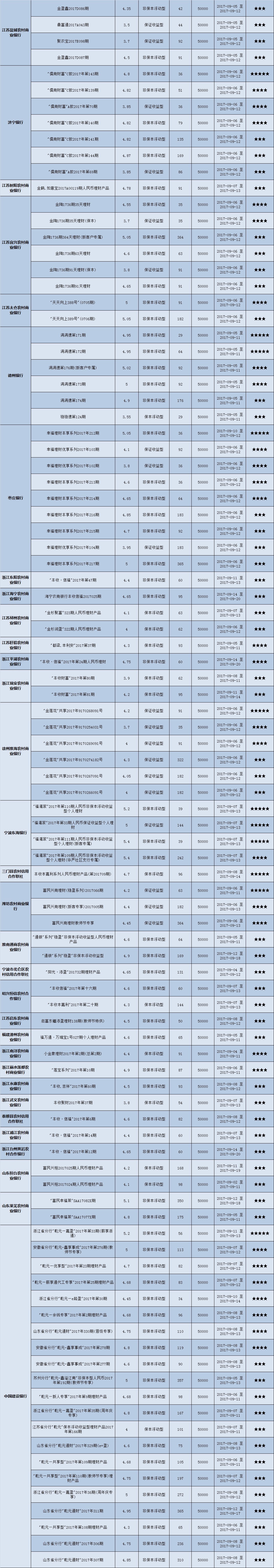高门槛(50万元及以上)的理财产品中,华东地区有41款获得普益标准星级评定,平均预期收益率为4.96%。其中三星产品17款,平均预期收益率为4.94%;四星产品16款,平均预期收益率为4.94%;五星产品8款,平均预期收益率为5.06%。