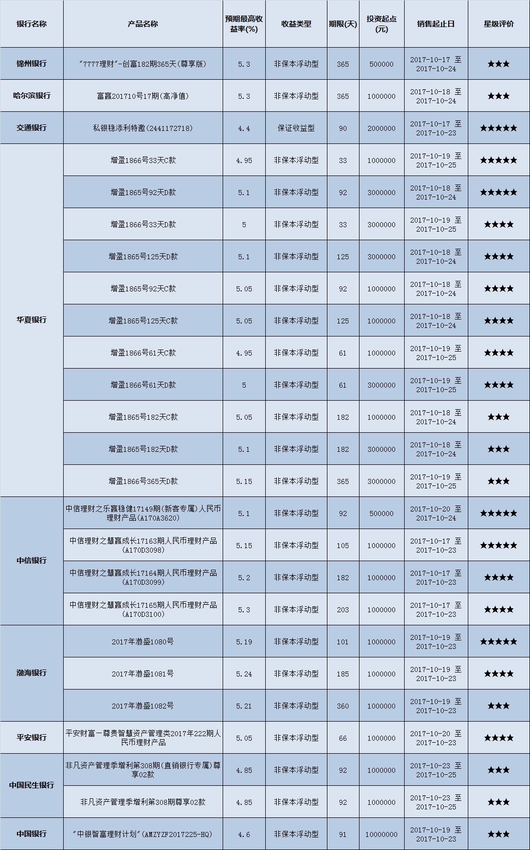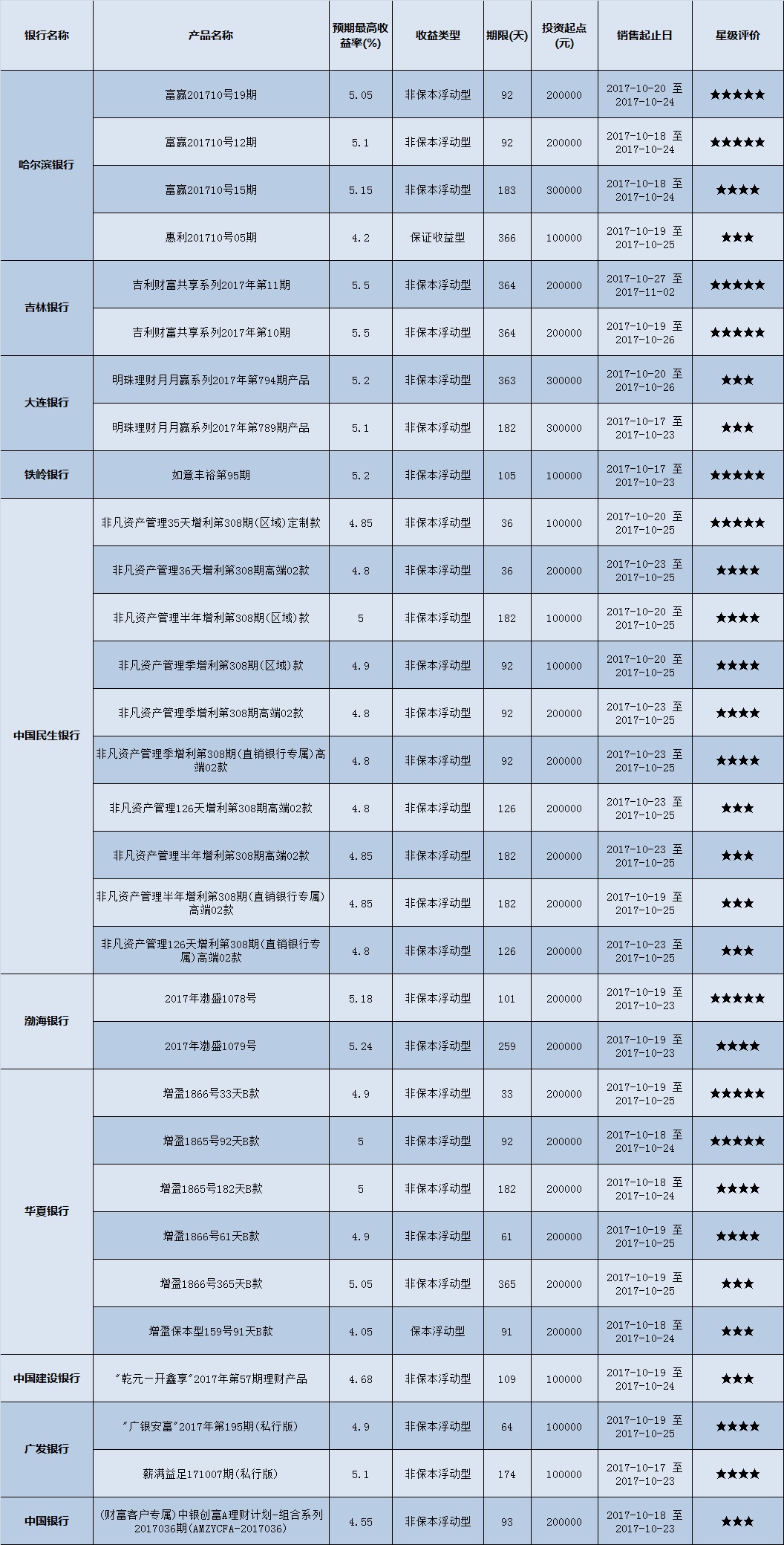 本周东北地区共306款产品在售,平均预期收益率为4.73%。其中,有251款产品获得普益标准星级评定,平均预期收益率为4.82%。其中,低投资门槛产品(10万元以下)195款,平均预期收益率为4.78%;中等投资门槛产品(10万元至50万元以下)31款,平均预期收益率为4.94%;高投资门槛产品(50万元以上)25款,平均预期收益率为5.05%。