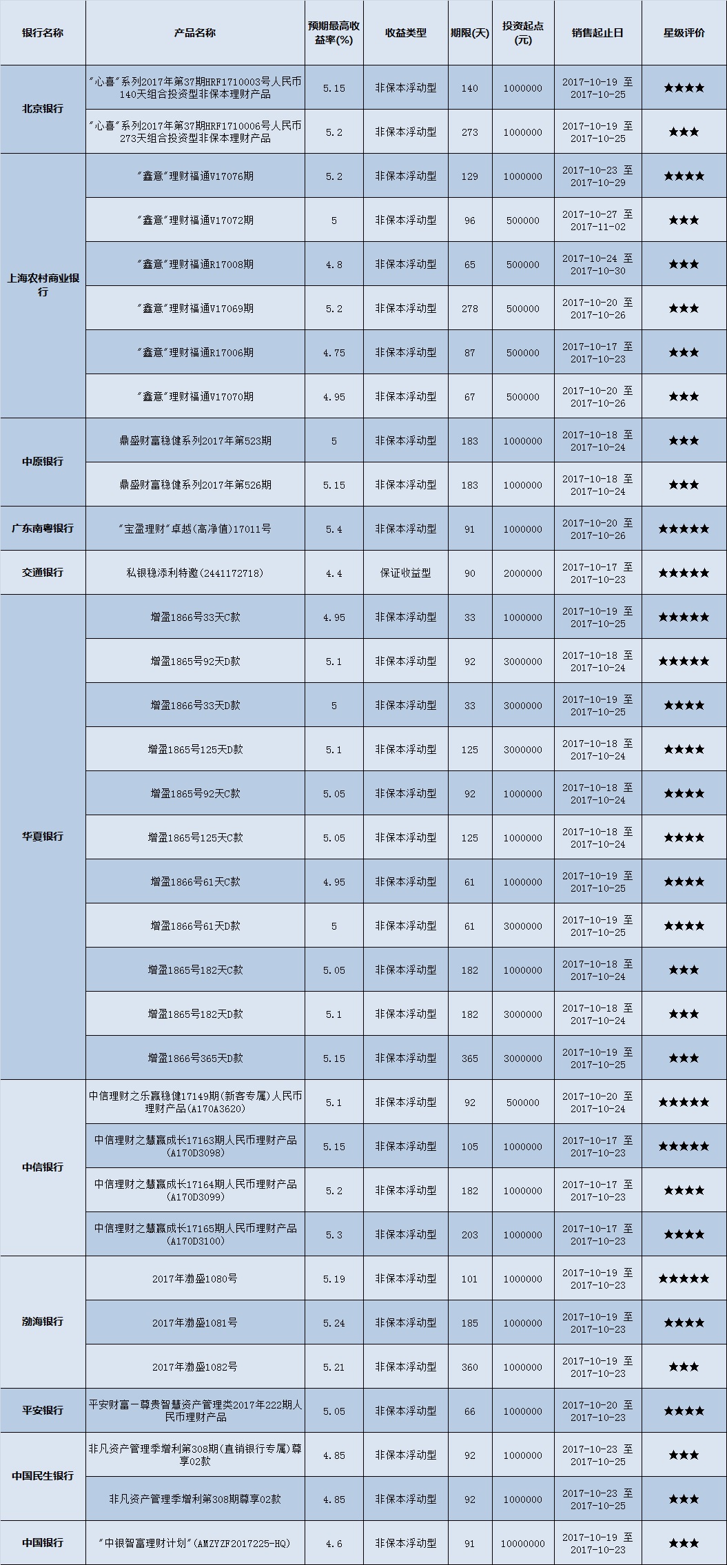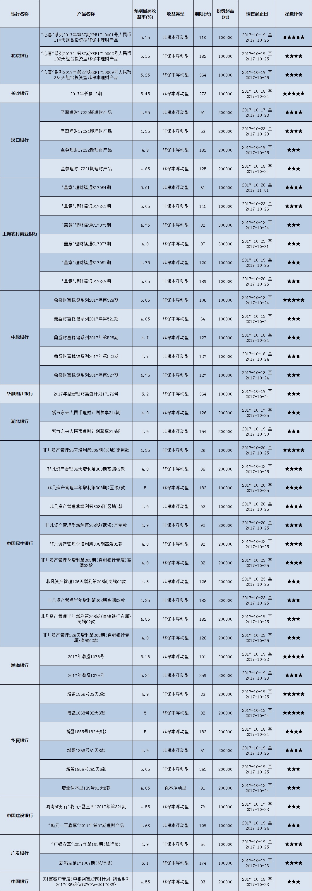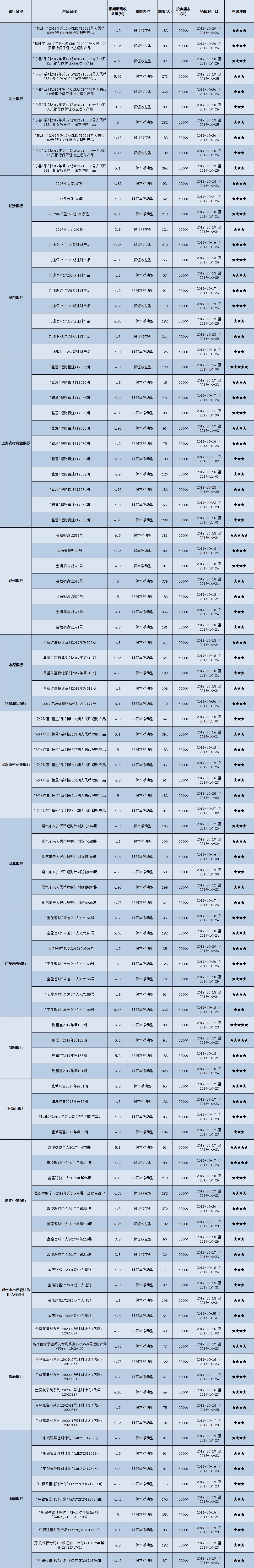 高门槛(50万元及以上)的理财产品中,华中地区有34款获得普益标准星级评定,平均预期收益率为5.04%。其中三星产品15款,平均预期收益率为4.99%;四星产品12款,平均预期收益率为5.11%;五星产品7款,平均预期收益率为5.04%。