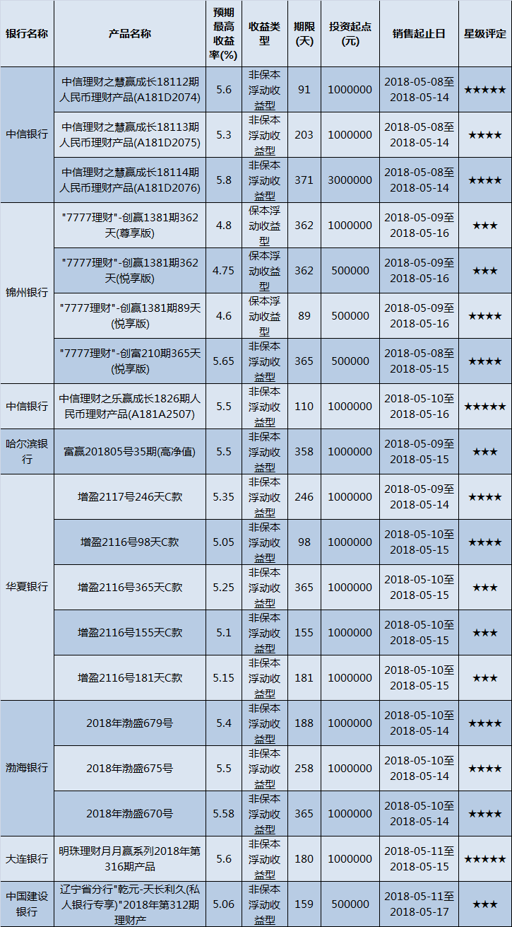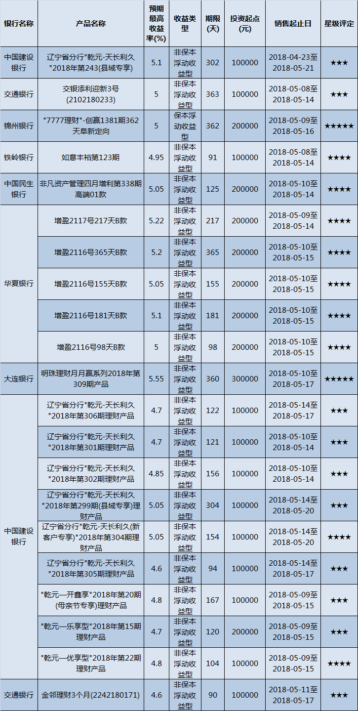 本周东北地区共268款产品在售,平均预期收益率为4.89%。其中,有205款产品获得普益标准星级评定,平均预期收益率为5%。其中,低投资门槛产品(10万元以下)165款,平均预期收益率为4.97%;中等投资门槛产品(10万元至50万元以下)21款,平均预期收益率为4.96%;高投资门槛产品(50万元以上)19款,平均预期收益率为5.29%。