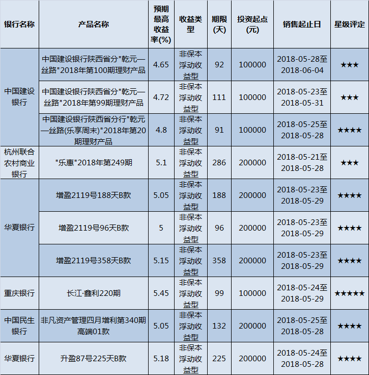 低门槛(10万元以下)理财产品中,西北地区有82款获得普益标准星级评定,平均预期收益率为4.94%。其中三星产品35款,平均预期收益率为4.69%;四星产品26款,平均预期收益率5.07%;五星产品21款,平均预期收益率为5.17%。