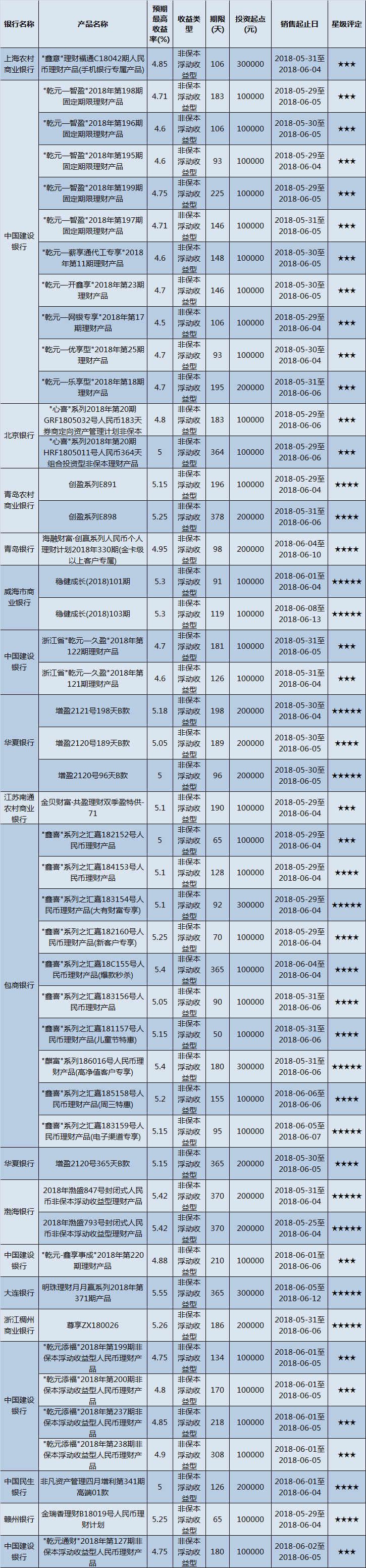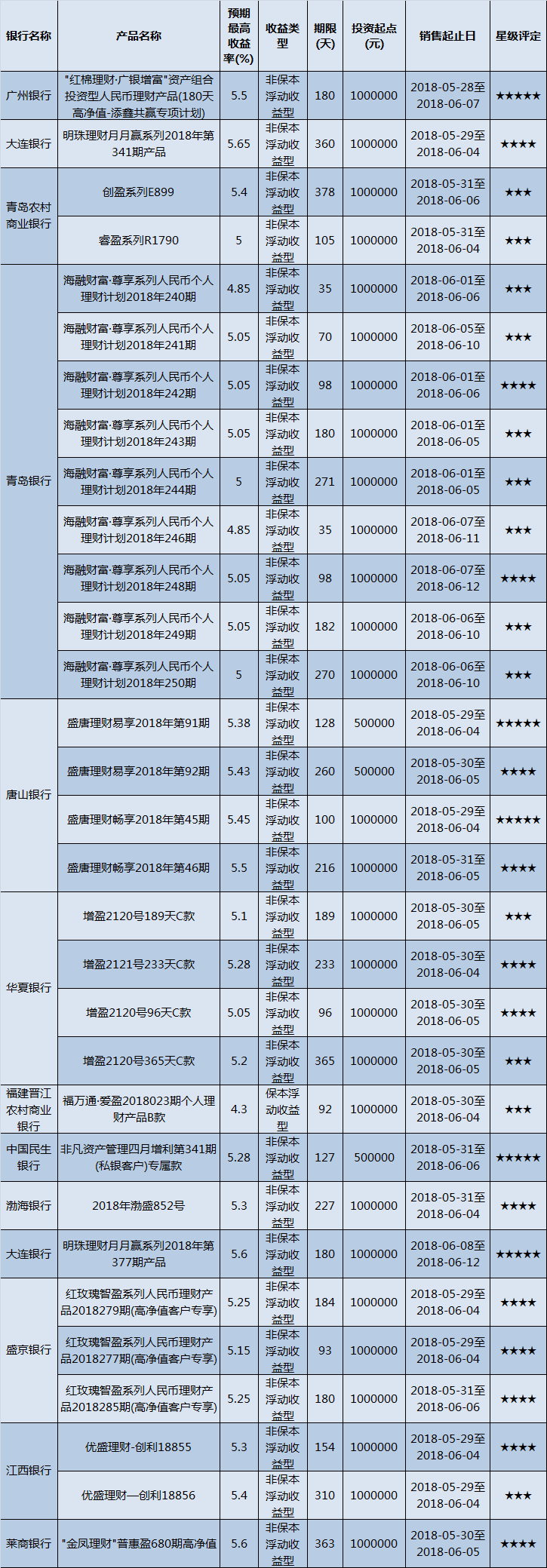 高门槛(50万元及以上)的理财产品中,华东地区有31款获得普益标准星级评定,平均预期收益率为5.2%。其中三星产品13款,平均预期收益率为5.02%;四星产品13款,平均预期收益率为5.3%;五星产品5款,平均预期收益率为5.44%。