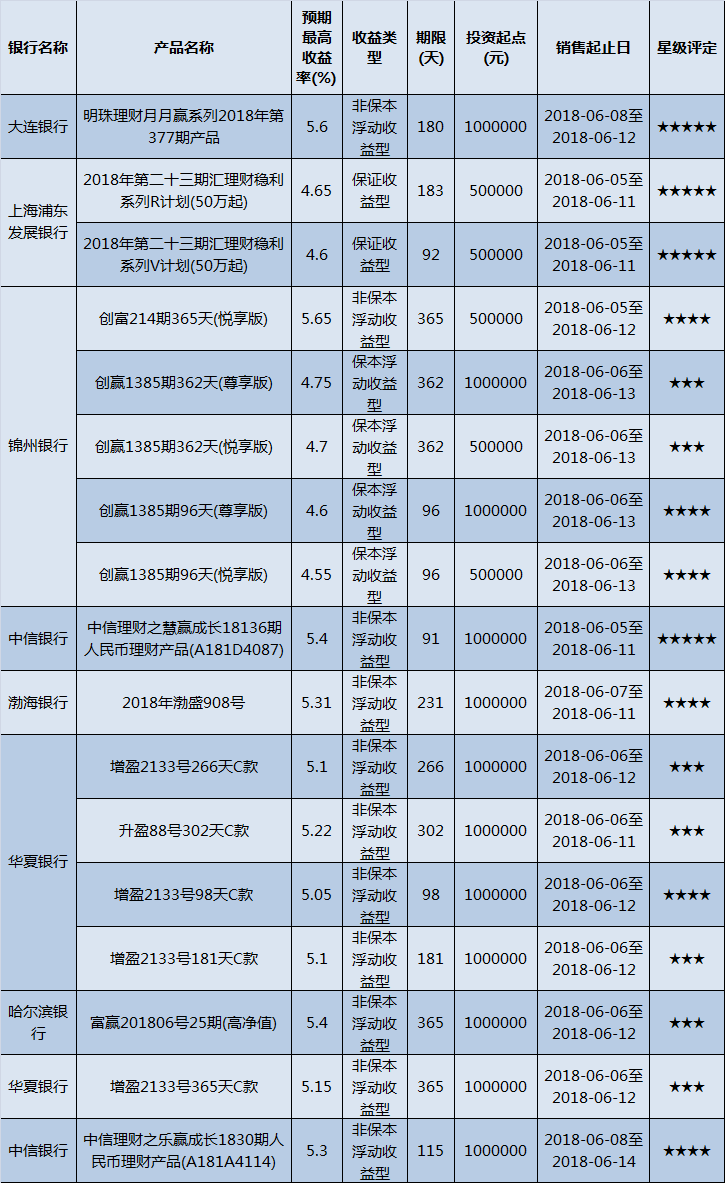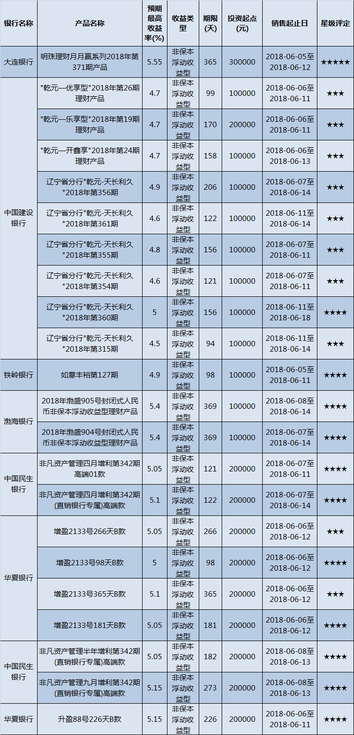 高门槛(50万元及以上)的理财产品中,东北地区有17款获得普益标准星级评定,平均预期收益率为5.07%。其中三星产品7款,平均预期收益率为5.06%;四星产品6款,平均预期收益率为5.08%;五星产品4款,平均预期收益率为5.06%。