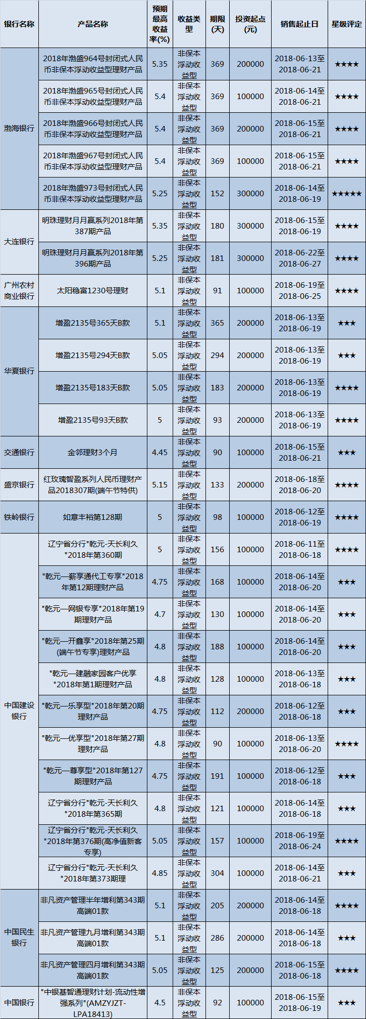 本周东北地区共277款产品在售,平均预期收益率为4.88%。其中,有227款产品获得普益标准星级评定,平均预期收益率为4.98%。其中,低投资门槛产品(10万元以下)166款,平均预期收益率为4.96%;中等投资门槛产品(10万元至50万元以下)30款,平均预期收益率为5%;高投资门槛产品(50万元以上)31款,平均预期收益率为5.06%。