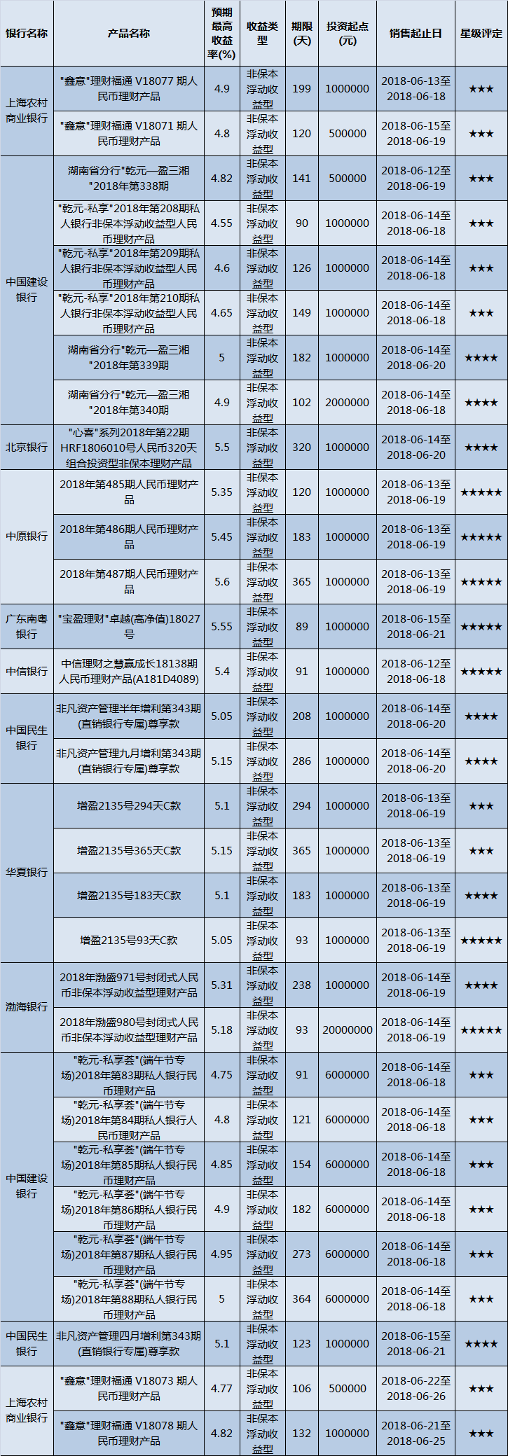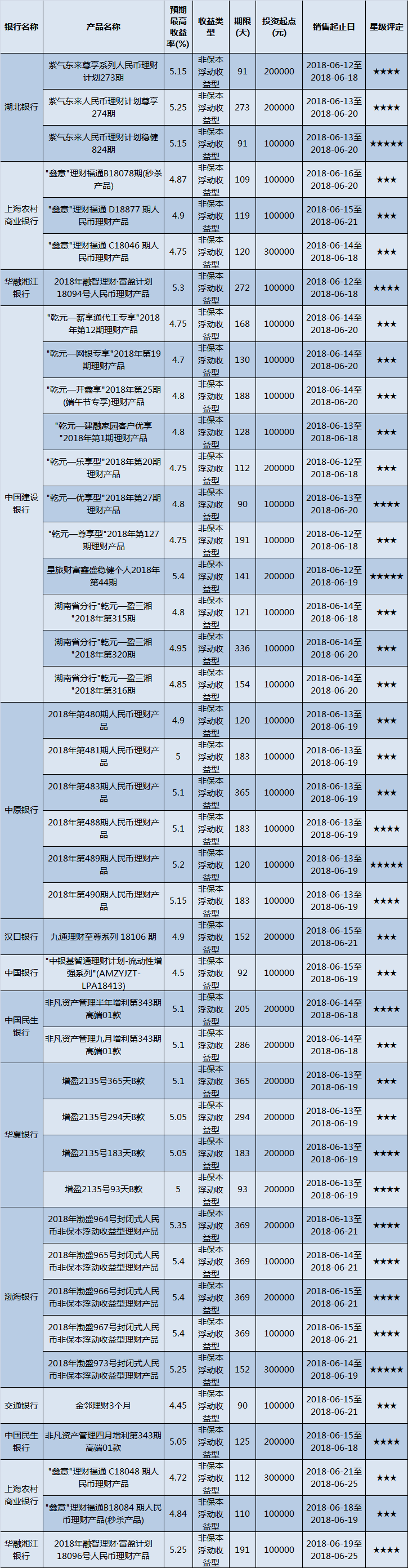 高门槛(50万元及以上)的理财产品中,华中地区有31款获得普益标准星级评定,平均预期收益率为5.04%。其中三星产品16款,平均预期收益率为4.84%;四星产品8款,平均预期收益率为5.14%;五星产品7款,平均预期收益率为5.37%。