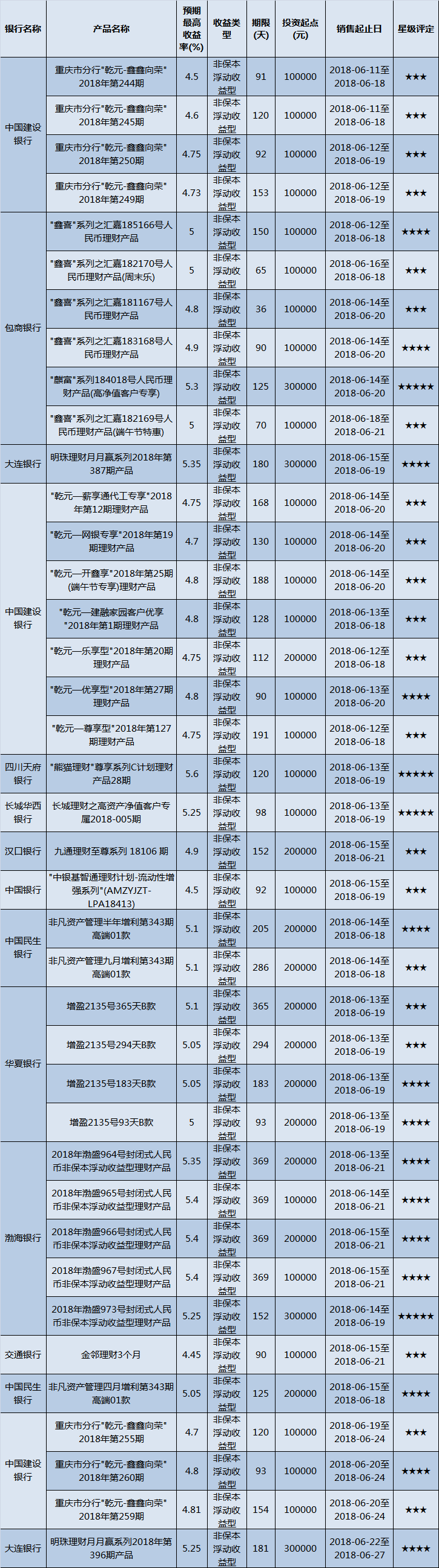 低门槛(10万元以下)理财产品中,西南地区有184款获得普益标准星级评定,平均预期收益率为5.02%。其中三星产品64款,平均预期收益率为4.78%;四星产品68款,平均预期收益率5.09%;五星产品52款,平均预期收益率为5.22%。