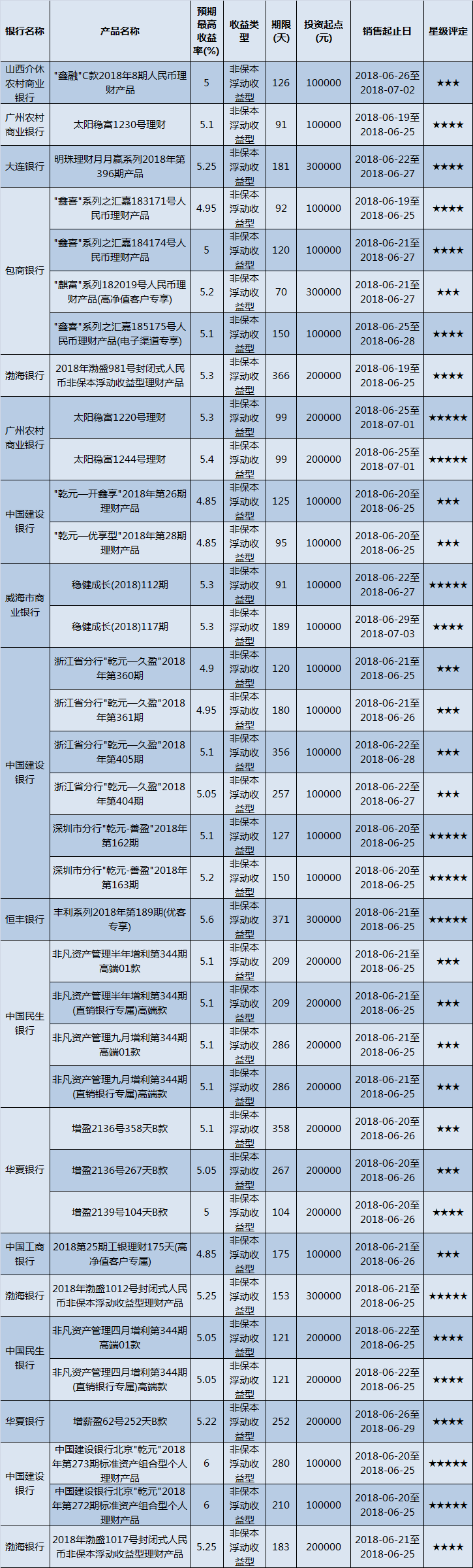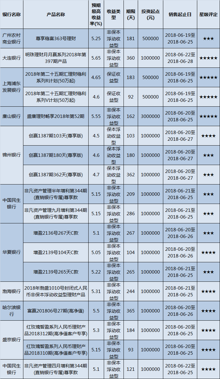 高门槛(50万元及以上)的理财产品中,华北地区有18款获得普益标准星级评定,平均预期收益率为5.08%。其中三星产品7款,平均预期收益率为5.02%;四星产品7款,平均预期收益率为5.13%;五星产品4款,平均预期收益率为5.11%。