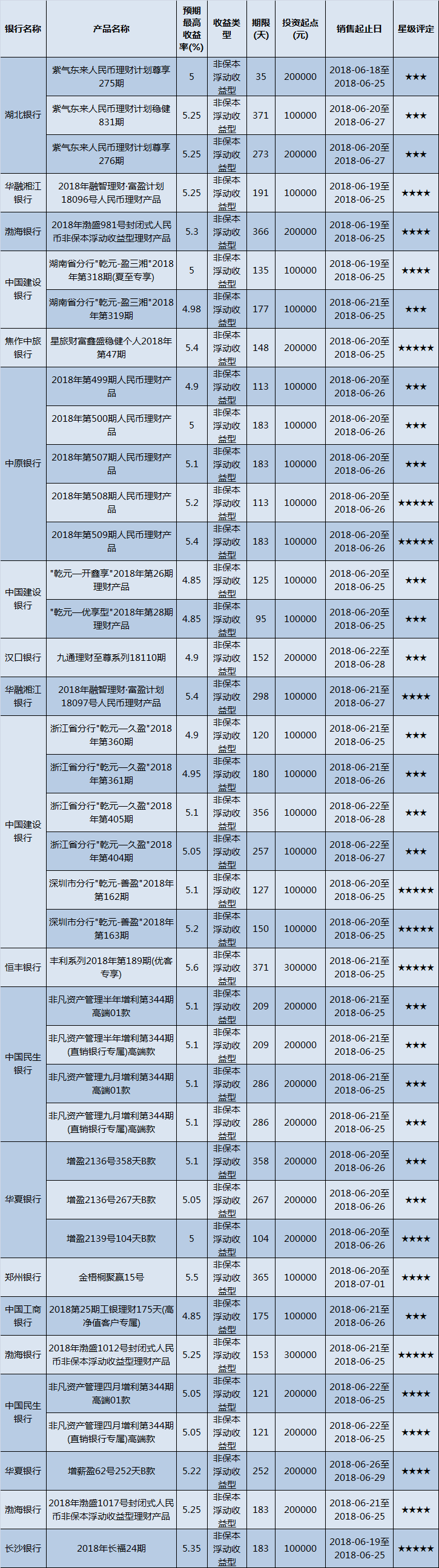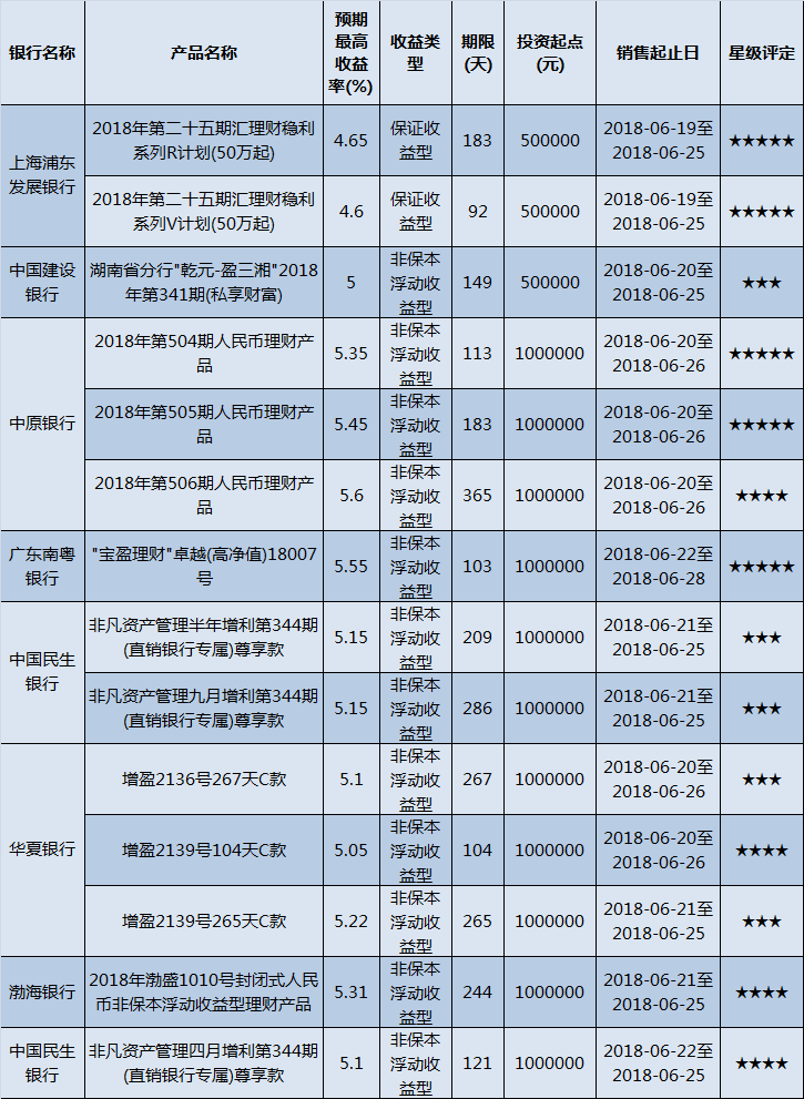 高门槛(50万元及以上)的理财产品中,华中地区有14款获得普益标准星级评定,平均预期收益率为5.16%。其中三星产品5款,平均预期收益率为5.12%;四星产品4款,平均预期收益率为5.26%;五星产品5款,平均预期收益率为5.12%。