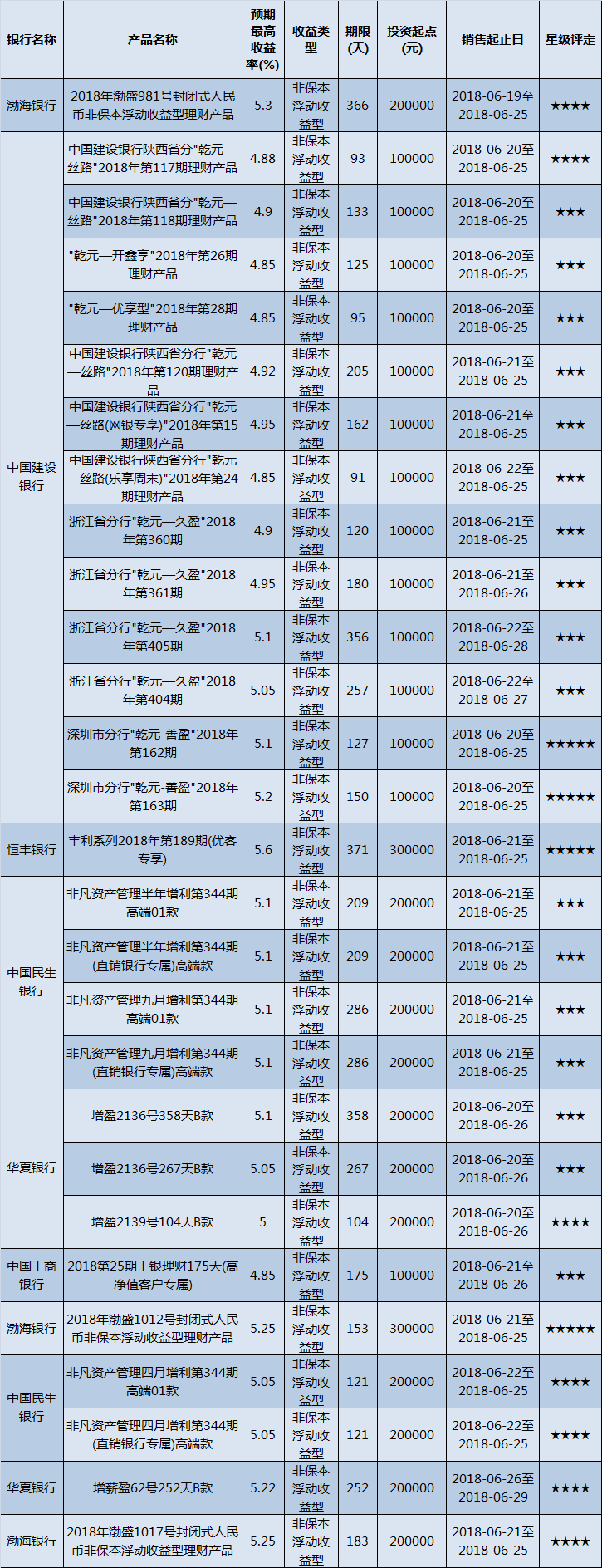 低门槛(10万元以下)理财产品中,西北地区有108款获得普益标准星级评定,平均预期收益率为4.94%。其中三星产品39款,平均预期收益率为4.67%;四星产品43款,平均预期收益率5.09%;五星产品26款,平均预期收益率为5.1%。