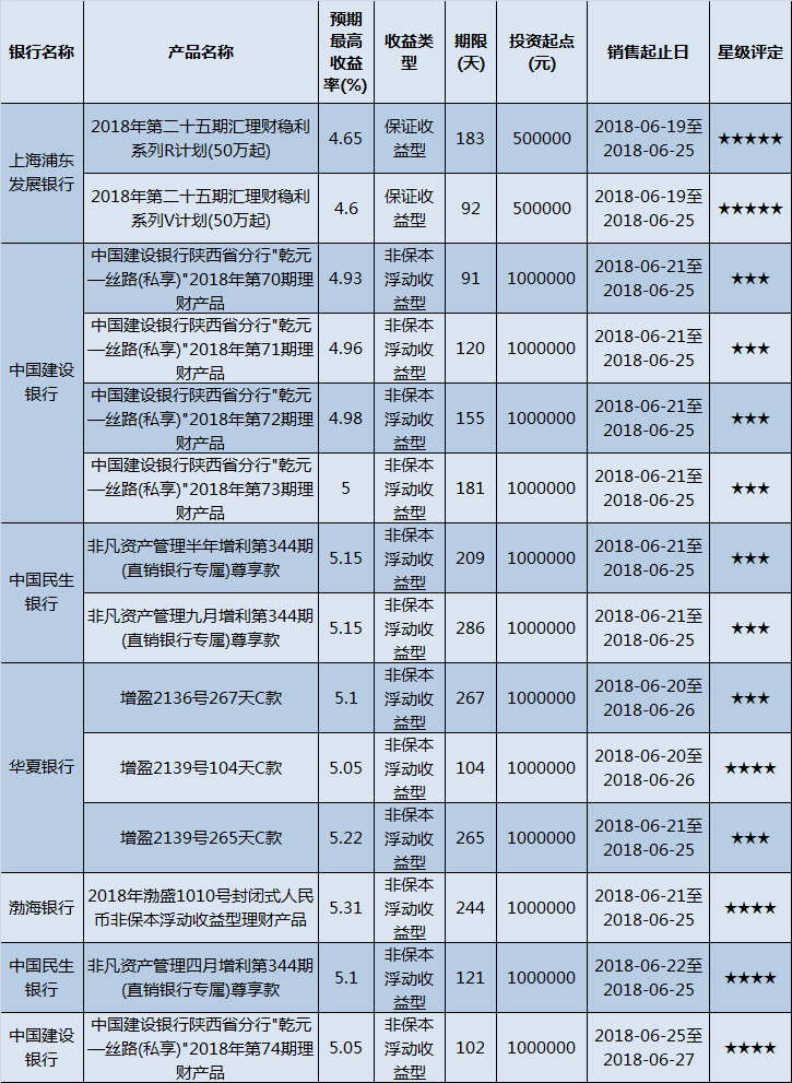 高门槛(50万元及以上)的理财产品中,西北地区有14款获得普益标准星级评定,平均预期收益率为5.02%。其中三星产品8款,平均预期收益率为5.06%;四星产品4款,平均预期收益率为5.13%;五星产品2款,平均预期收益率为4.62%。