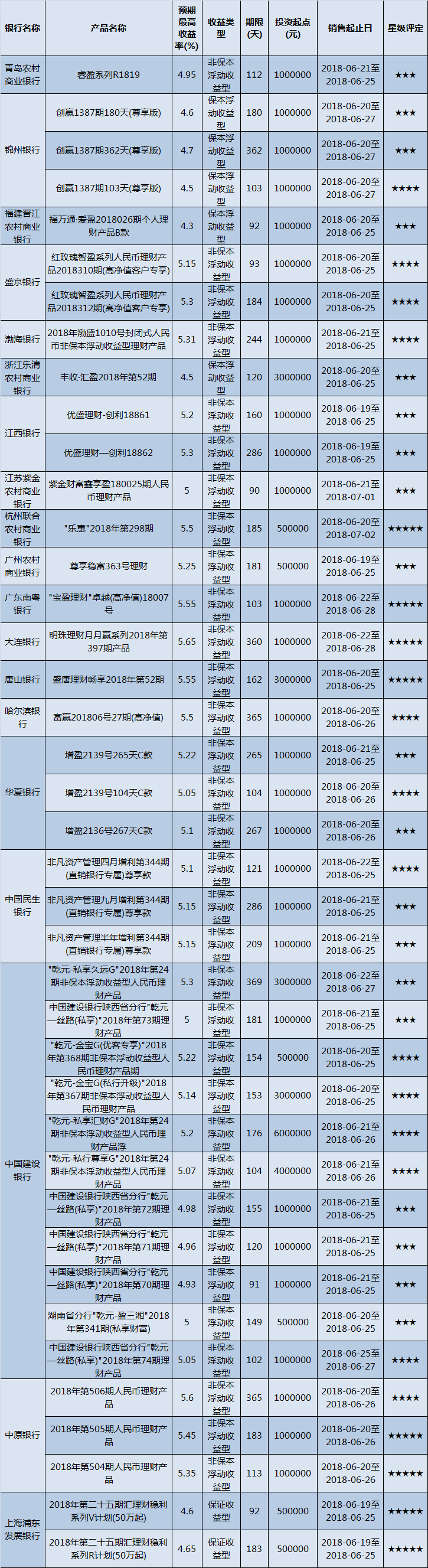 本周投资门槛在10万元以下的产品有991款,平均预期收益为4.77%。其中有743款获得普益标准星级评定,平均预期收益率为4.94%。其中三星产品347款,平均预期收益率为4.77%;四星产品248款,平均预期收益率为5.07%;五星产品148款,平均预期收益率为5.15%。