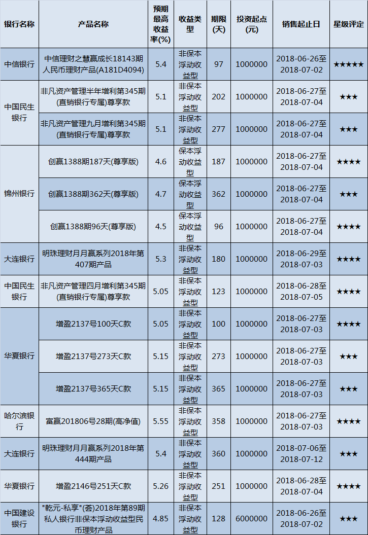 本周东北地区共253款产品在售,平均预期收益率为4.89%。其中,有191款产品获得普益标准星级评定,平均预期收益率为4.99%。其中,低投资门槛产品(10万元以下)150款,平均预期收益率为4.97%;中等投资门槛产品(10万元至50万元以下)26款,平均预期收益率为5.04%;高投资门槛产品(50万元以上)15款,平均预期收益率为5.08%。