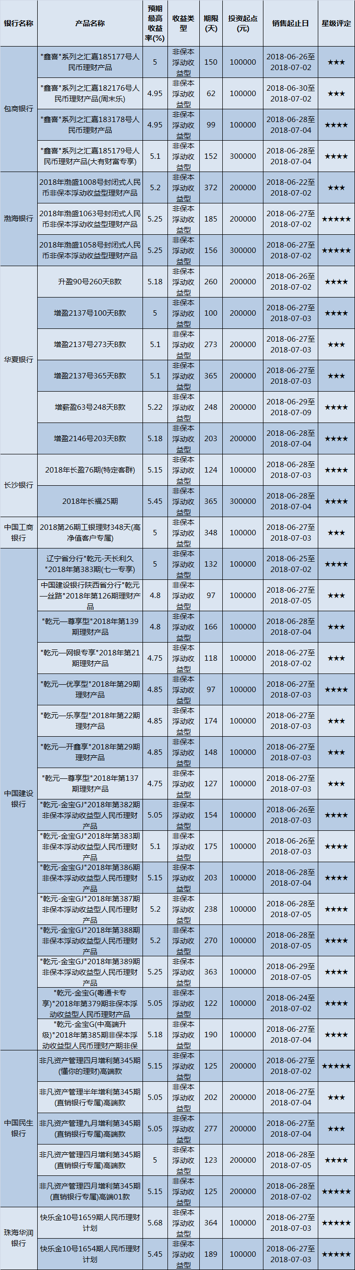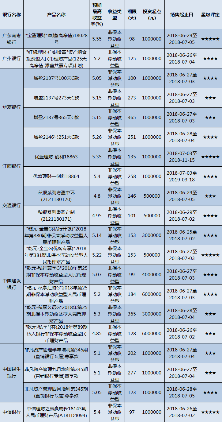 高门槛(50万元及以上)的理财产品中,华南地区有20款获得普益标准星级评定,平均预期收益率为5.16%。其中三星产品7款,平均预期收益率为5.06%;四星产品9款,平均预期收益率为5.15%;五星产品4款,平均预期收益率为5.38%。